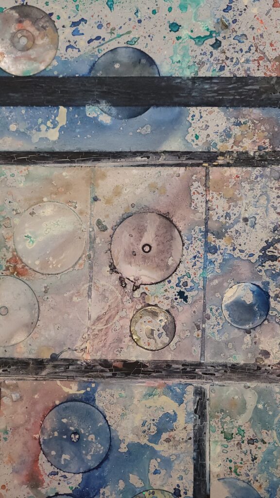 Isso espelha seu uso de CDs como “dispositivos anacrônicos” embutidos no piso. Nem as lajes de aço nem os discos ópticos servem mais às suas funções originais de armazenamento ou estrutura. Eles foram aterrados, forçados ao plano horizontal para se tornarem matéria reflexiva e estética. Ambos estabelecem uma economia temporal instável, marcando o piso não como uma fundação estática, mas como um local de sedimentação histórica.