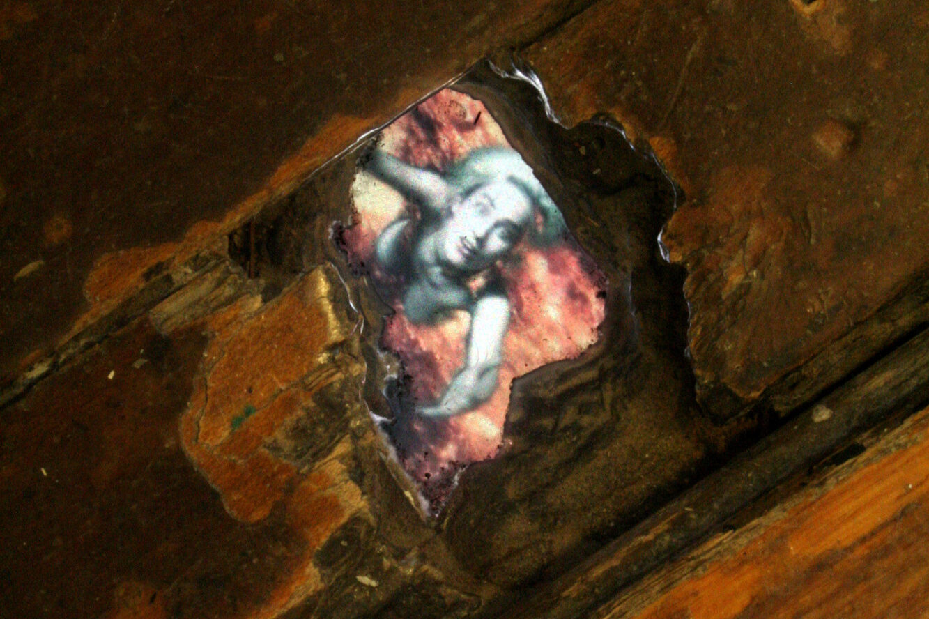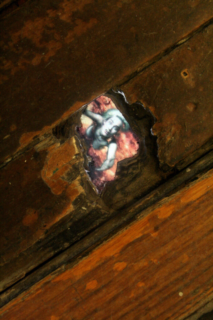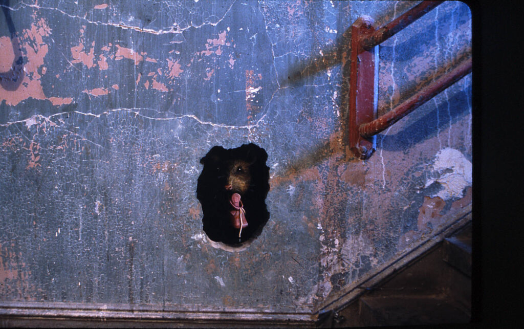 Se Selbstlos im Lavabad, de Rist, representa terra líquida irrompendo de um nó nas tábuas do piso, a criatura de Rockman é a necessidade biológica da decomposição. A obra ocupa uma ruptura literal no reboco descascado, uma ferida na arquitetura. O detalhe da língua da criatura que emerge do vazio, ultrapassando a soleira da parede, ativa o buraco não como um mero elemento de enquadramento, mas como uma boca que respira e consome.