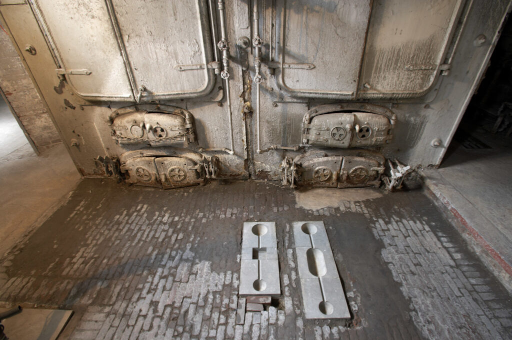 A colocação de lajes de aço por Mullican na sala de caldeiras do MoMA PS1 dialoga diretamente com a lógica espacial do banheiro. Tanto a sala de caldeiras quanto o banheiro são as entranhas utilitárias e ocultas da arquitetura, espaços definidos por encanamento, regulação térmica, dinâmica de fluidos e resíduos. Ao inserir seus símbolos no piso dessa zona funcional, Mullican trata a infraestrutura do edifício como um sítio arqueológico.