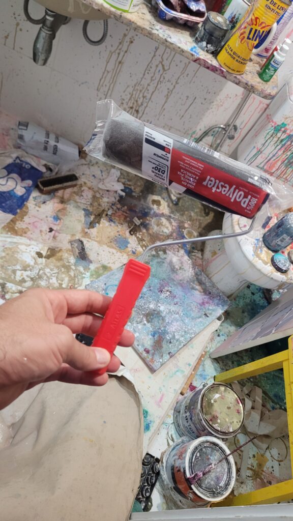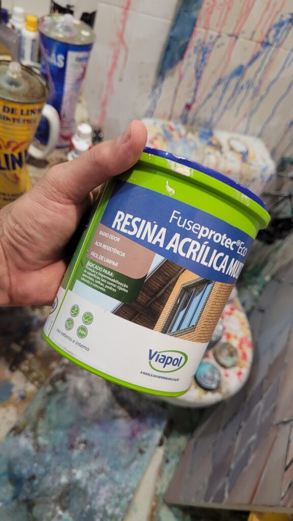 Em seu texto anterior, você observou que a decisão entre “fixar ou permitir que as camadas se desprendam” é epistemológica. Ao introduzir esta resina acrílica específica aplicada com o rolo de poliéster sintético sobre os respingos caóticos e reativos de pigmento, resíduos domésticos e CDs embutidos você está fazendo a escolha definitiva de fixar.