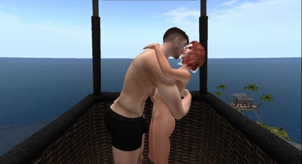 A plataforma suspensa de Agata em Second Life era, literalmente, a sua cama voadora. Um espaço flutuante, desconectado do chão opressivo do isolamento da pandemia, onde o amor, o desejo e a experimentação identitária podiam acontecer de “frente, de trás”, sem o peso do julgamento ou as limitações do corpo de carne e osso.
