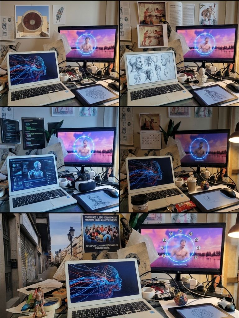 Epistolário com a Máquina. Um espaço em processo, em que pintura, escultura, escrita e pensamento se enredam como organismos em formação contínua. Entre estratos de tinta, carvão, luz e silêncio, emergem diálogos com a máquina, fragmentos de mundo e formas se apresentam. Este não é um arquivo estável: é um campo de escuta, fricção e matéria em transformação.