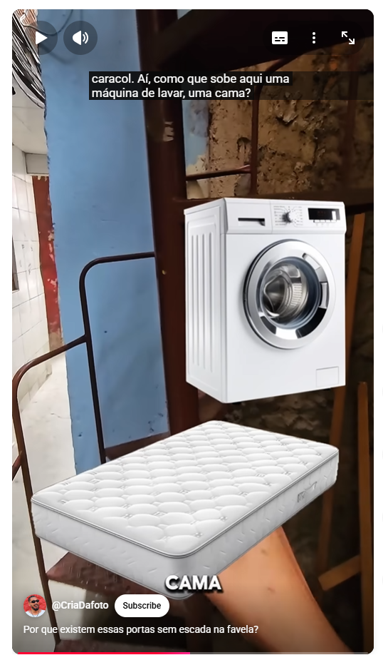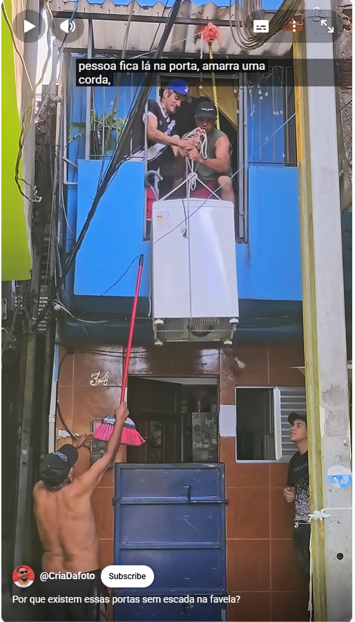 Muitas vezes, como mostra a sequência do vídeo, há escadas caracol internas ou escadas metálicas externas que conectam os módulos, mas os acessos frontais são reservados para transporte de móveis, eletrodomésticos, ou para o futuro encaixe de outro módulo.
