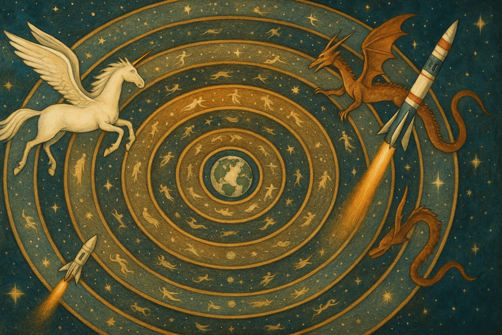 O novo blog — Esferas Celestes — é o terraço, o plano superior onde as conexões se tornam visíveis, e onde as cordas (links) amarram o conjunto.
