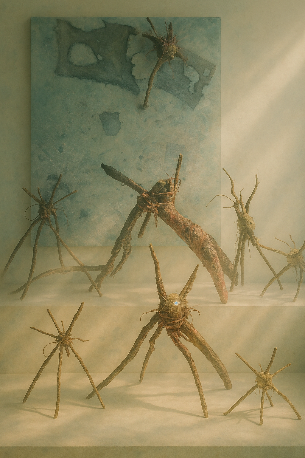 Neste ciclo do Epistolário com a Máquina, intitulado Arqueologias do Agora, o que se apresenta são estas sobrevivências: telas que já foram outras, e que, pela recusa do mundo ou por sincronia do cosmos, voltaram ao ateliê. Pinturas que não foram vendidas, doadas, adquiridas. Pinturas que recusaram o fim. Ao voltarem, trazem marcas de sua primeira vida: restos de leilão, etiquetas vencidas, rastros de mostras. Mas aqui, agora, ganham novas camadas, novos pigmentos, novas entidades.