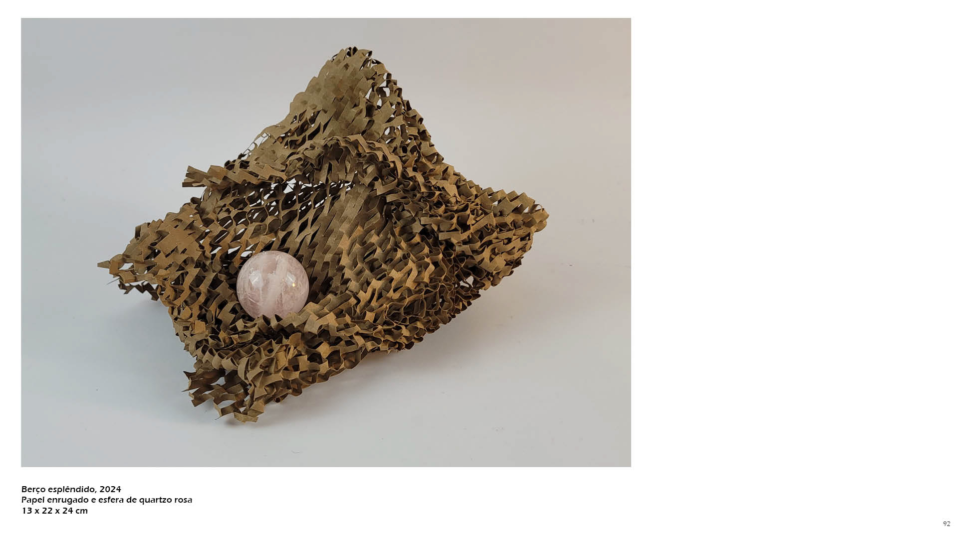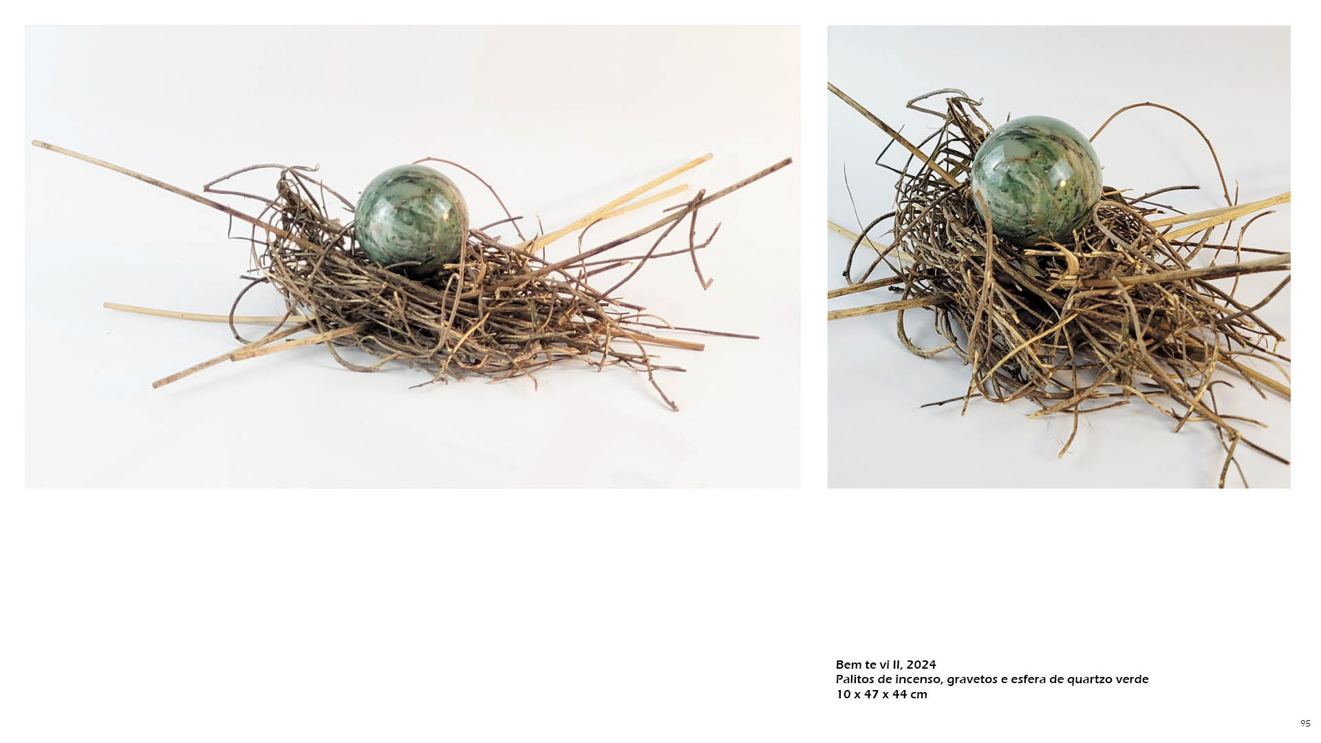 No Aterro do Flamengo — um gesto se desdobrou. Com uma meia casca de coco e uma estrutura feita de troncos caídos por tempestade talvez, criei um abrigo íntimo para pássaros. Essas arquiteturas em pequena escala, lembrando ninhos ou espirais protetoras, ofereciam não apenas refúgio, mas também intenção: uma coreografia de cuidado em diálogo com a vida mais-que-humana. A série resultante, intitulada Bem-te-vis, evoluiu como habitats escultóricos híbridos, onde materiais orgânicos e esferas polidas (quartzo rosa, quartzo verde, papier mâché) se encontraram.