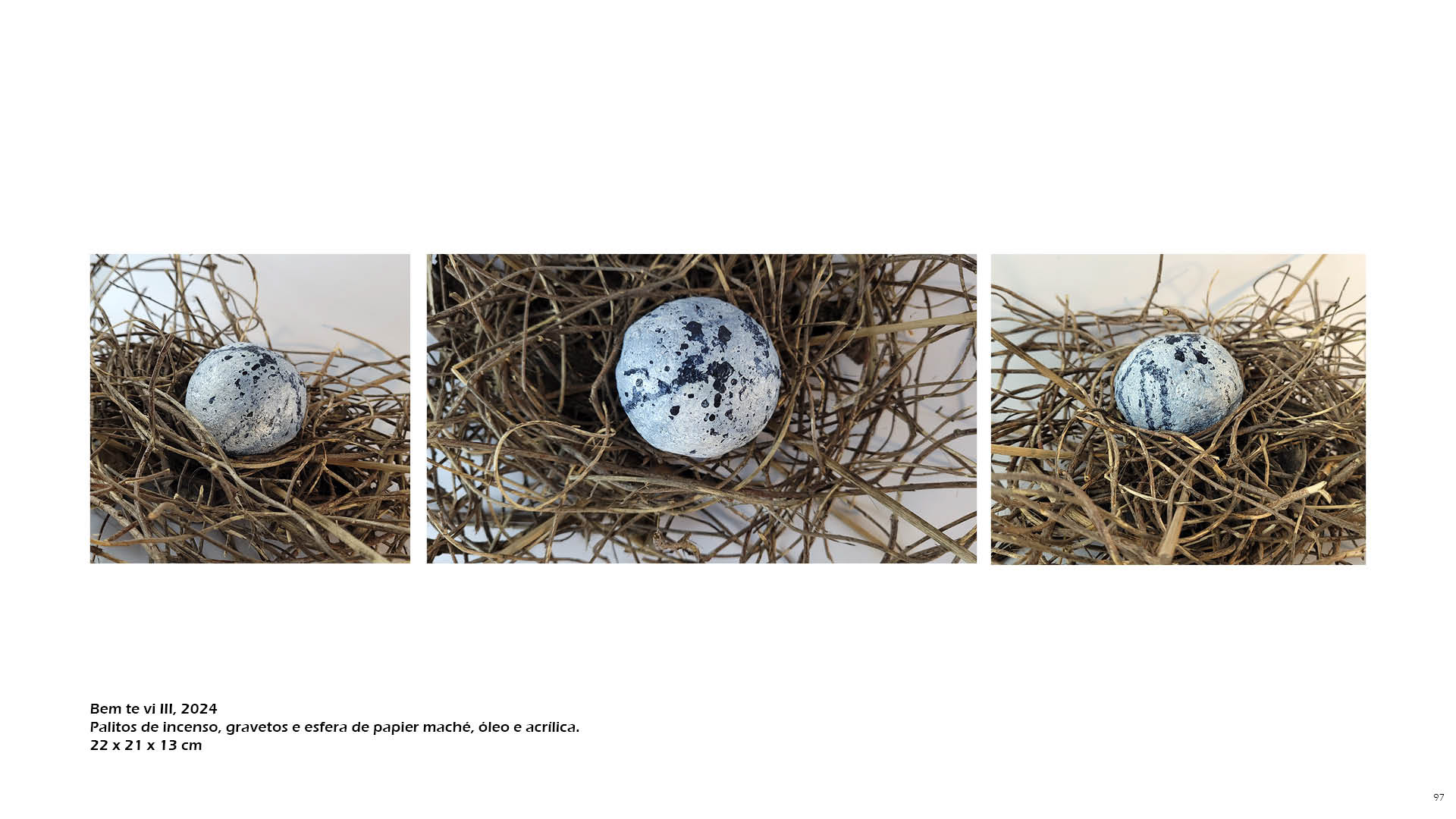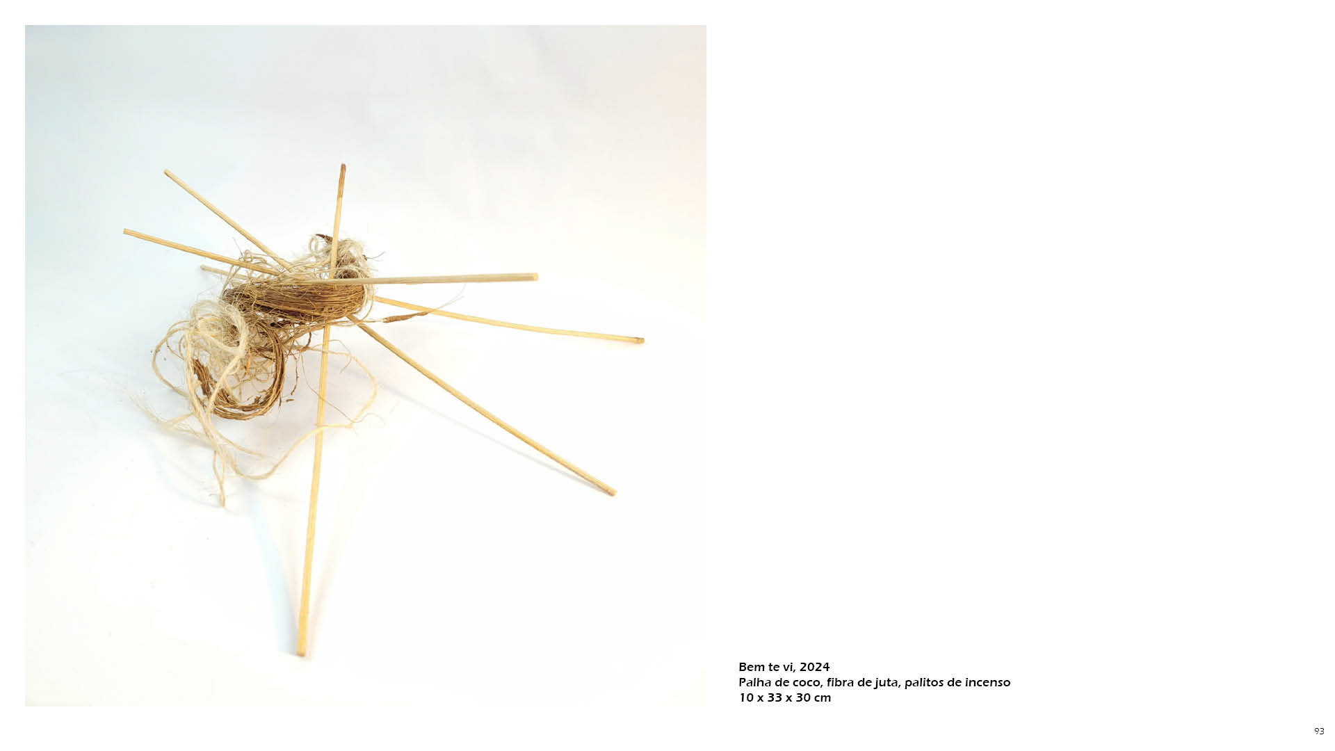 O que emergiu foi uma prática relacional da arquitetura como oferenda — não voltada para a permanência, mas para a presença. Essas obras canalizam uma estética da proteção, da vibração e da monumentalidade efêmera. Ecoando tradições de construção de ninhos, da land art e da escultura devocional, elas também ressoam com sensibilidades ecológicas contemporâneas e discursos artísticos multiespécie. Se Louise Bourgeois entalhava emoção em espirais de bronze, e Nils-Udo construía altares para árvores e aves, Bem-te-vis oferece uma nota de rodapé íntima: um ninho como antena, onde a ternura se espacializa e o abrigo torna-se gesto.
