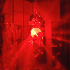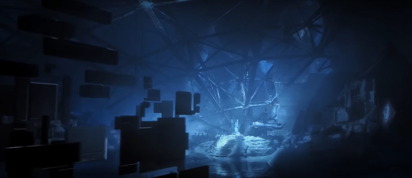 um ambiente escuro, banhado em luz vermelha, com uma figura escultural no centro irradiando feixes de luz,