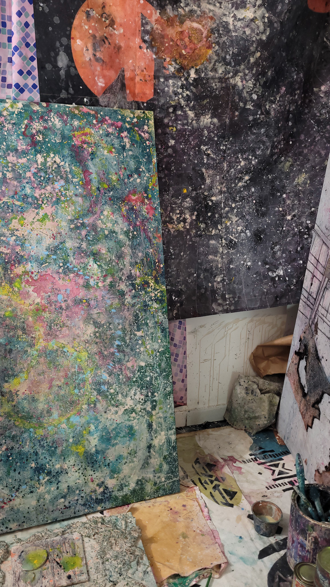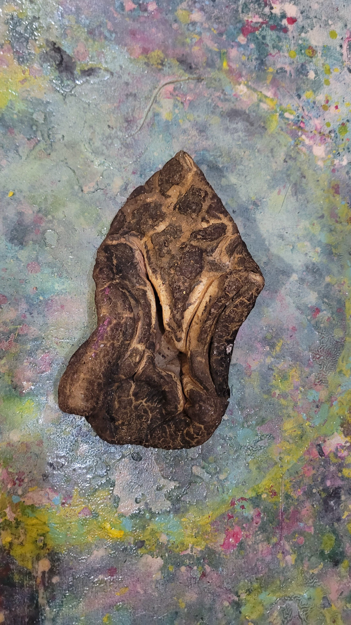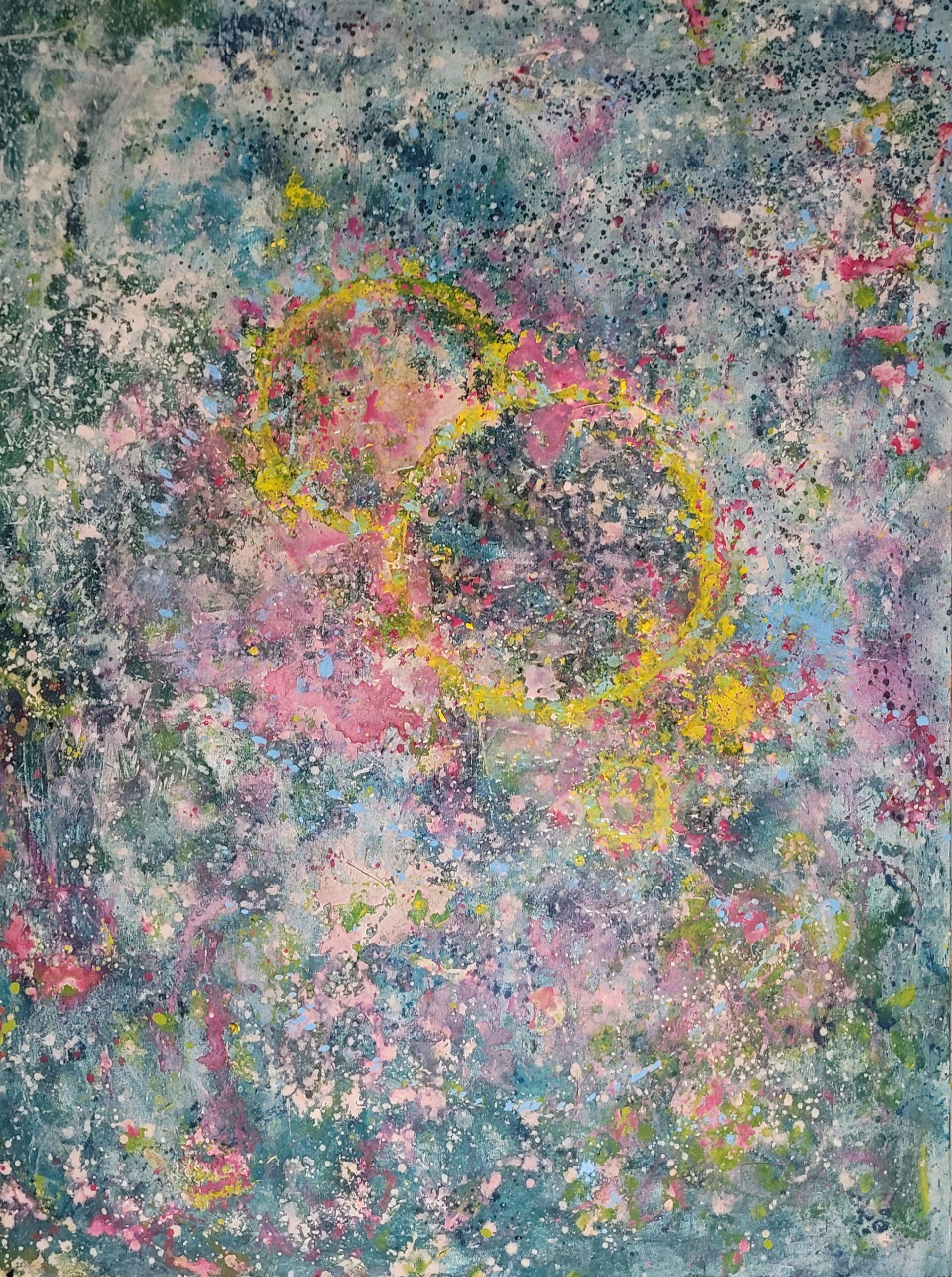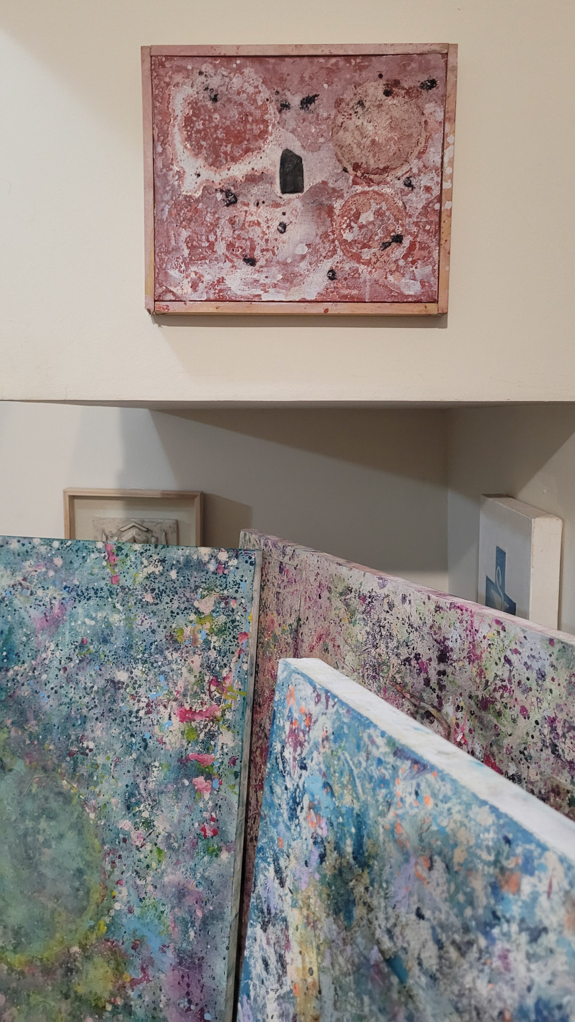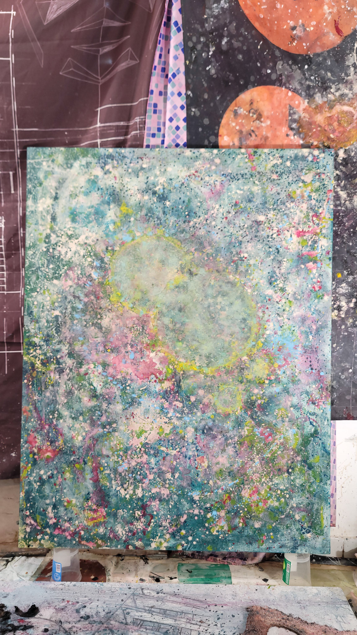 Esta pintura, agora nomeada poeticamente, nasce da fricção entre camadas e constelações. Uma superfície onde o gesto se acumula como húmus, e os símbolos — antes comestíveis, ritualísticos, agrícolas — voltam a ser matéria e vibração.