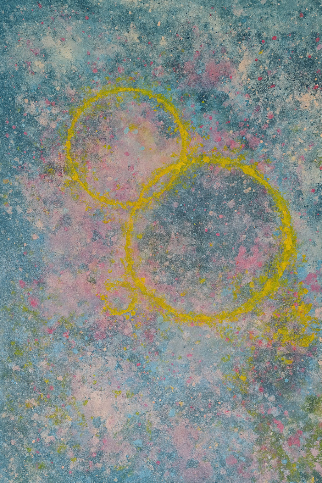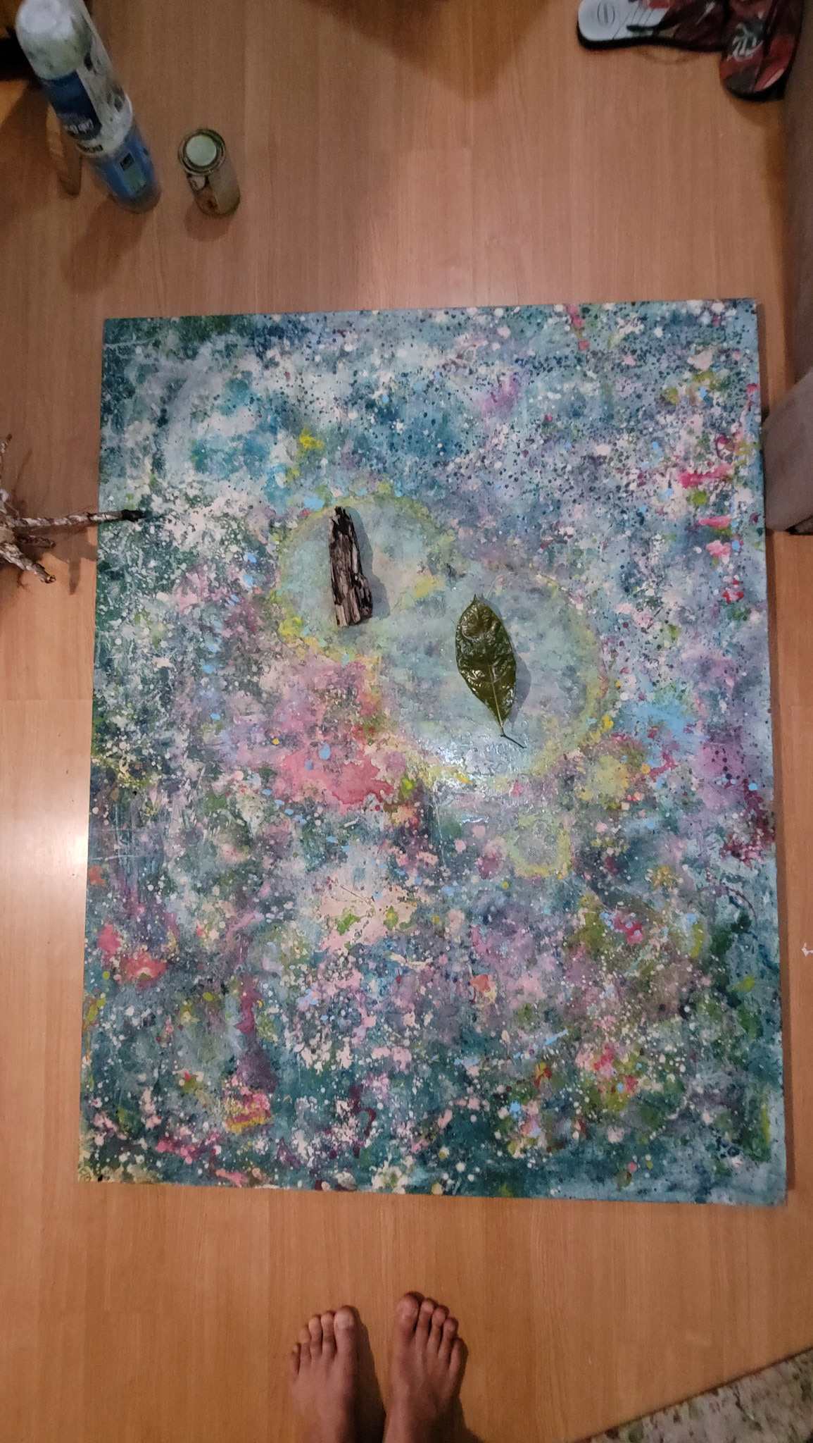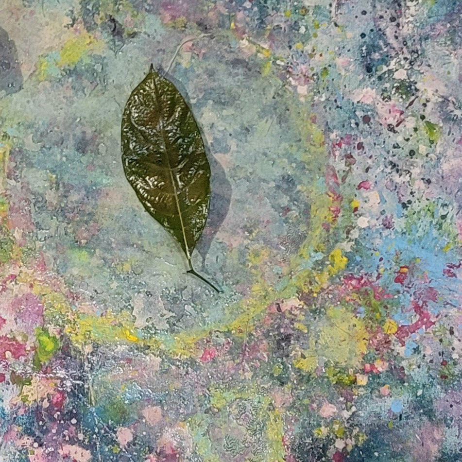Na composição, a folha age como zona viva, enquanto o satélite é zona escura. Entre eles, a pintura vibra como um organismo simbiótico, uma constelação de pigmentos e gestos que se acumulam como sedimentos, como sonho impresso em matéria.
