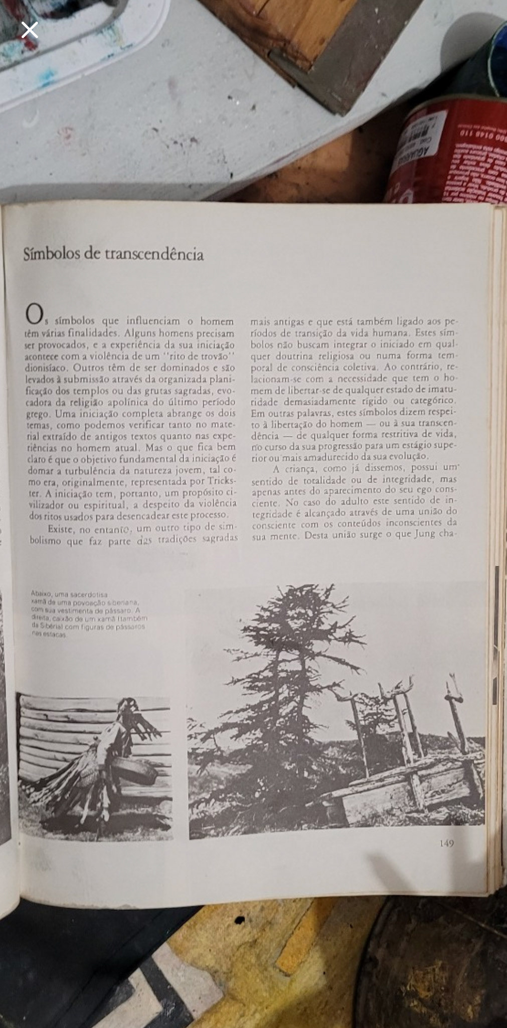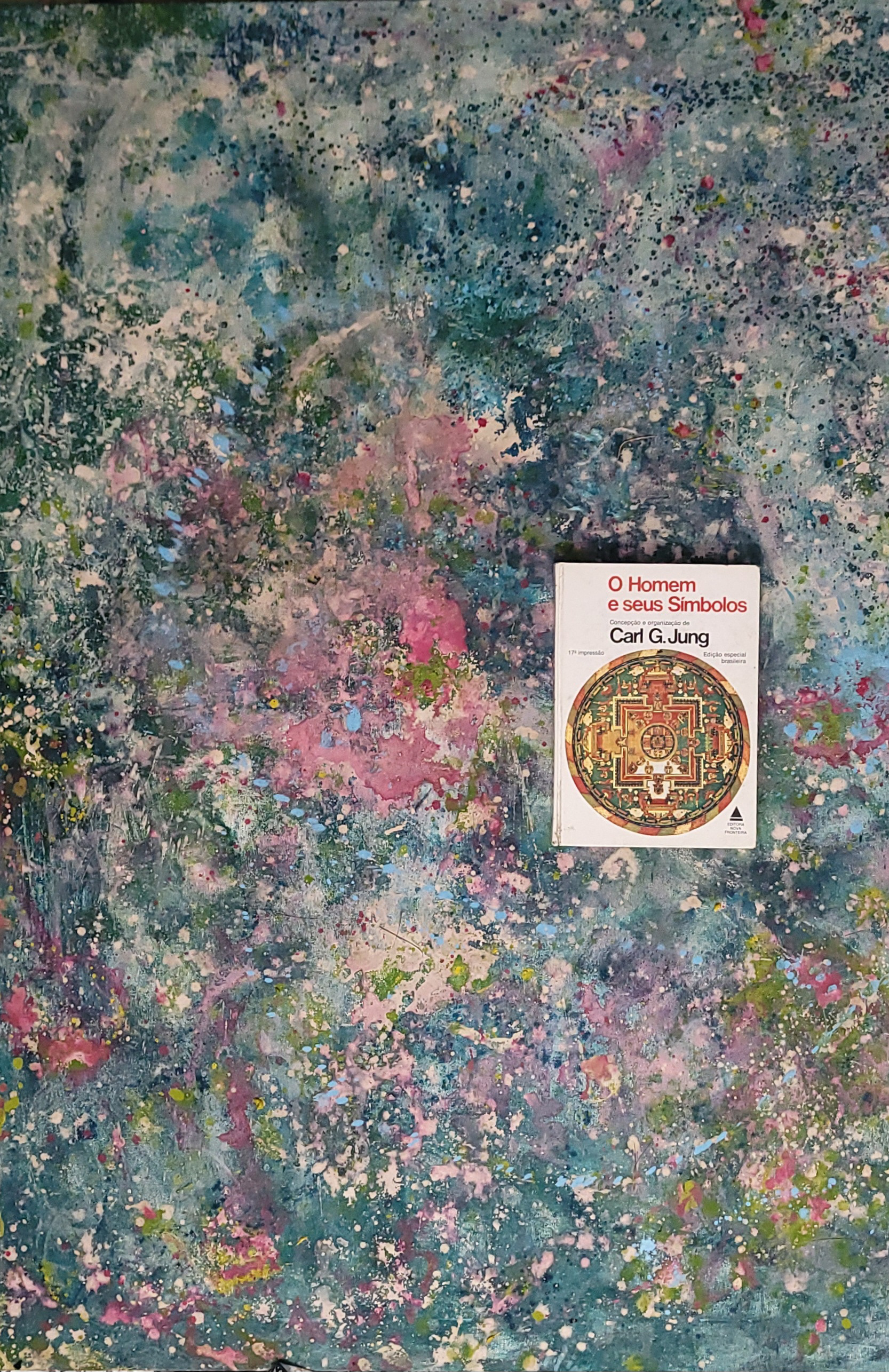 - **Carl G. Jung**, cujo livro *O Homem e Seus Símbolos* aparece sobre a tela em fotografias do processo. A mandala tibetana da capa torna-se um campo estruturante, espelhando a dinâmica circular da própria pintura. Os símbolos não representam — organizam.