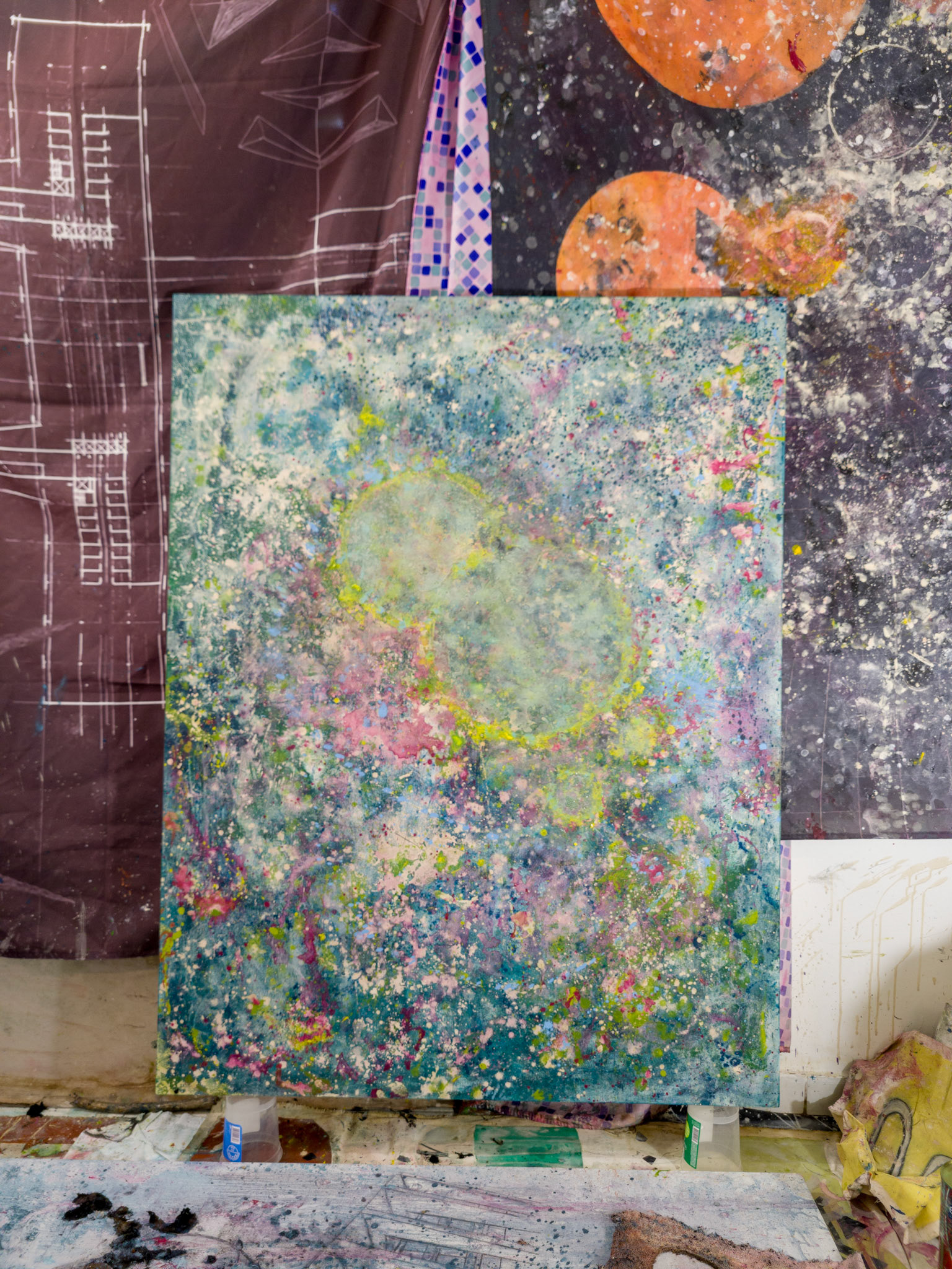 At the heart of the current painting cycle lies a world-to-come: an edible forest, composed through geometric mandalas. The still-wet layers already suggest this threshold zone, where pitayas, passionfruit flowers, watermelon blooms and wind vectors emerge as visual prophecies. The work is still breathing, still ripening — and precisely because of that, it already points with strength toward the future it springs from.