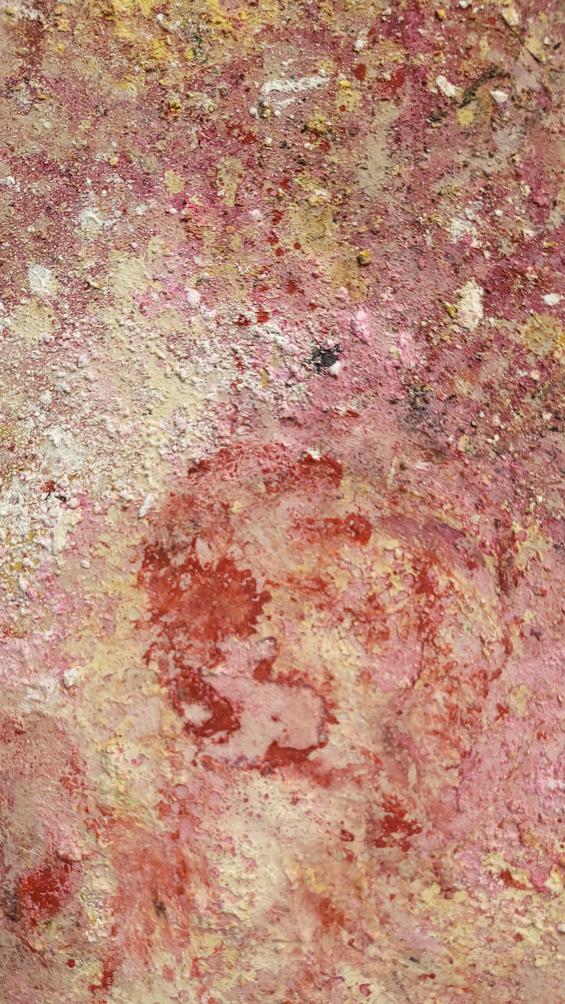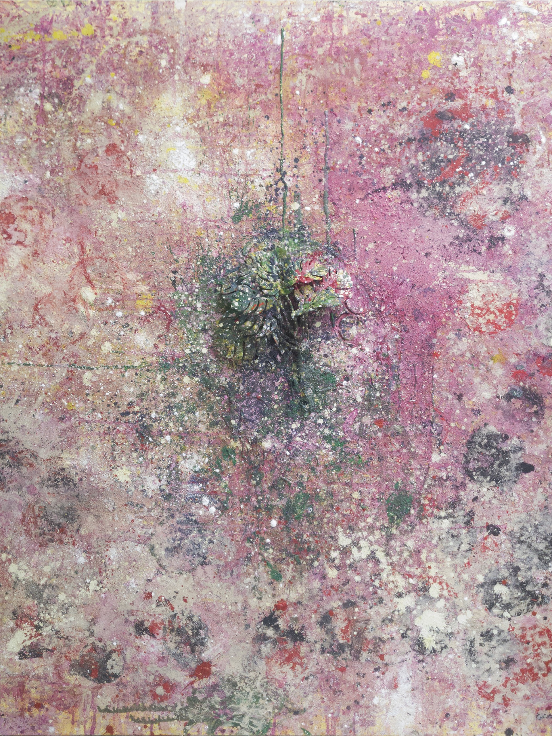 Óleo, acrílica, tinta de tecido, tinta de metal, cera de abelha, giz de cera, objeto achado e carbonato de cálcio sobre tela