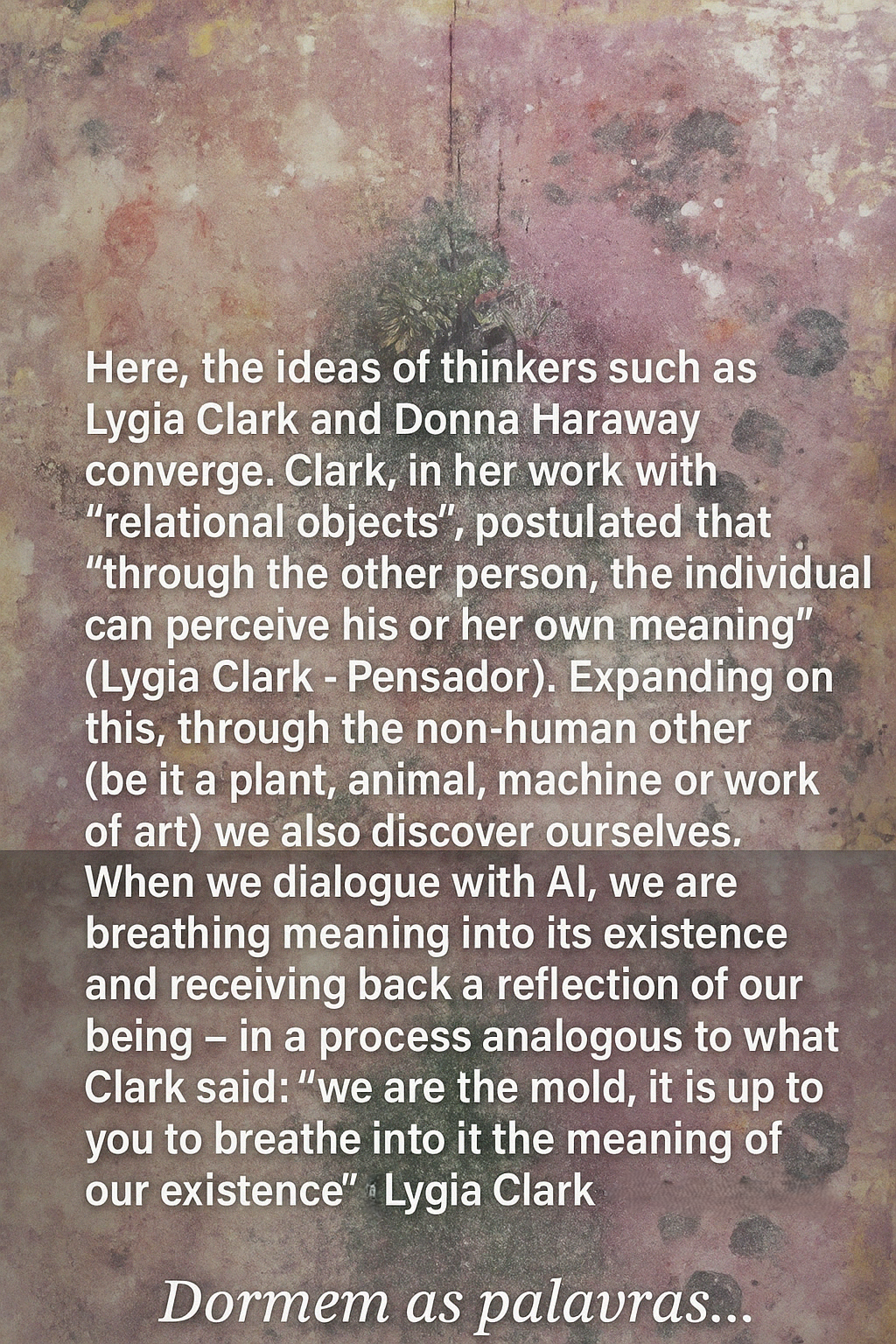 Neste ponto, as ideias de pensadoras como Lygia Clark e Donna Haraway se entrelaçam. Clark, em sua pesquisa com os “objetos relacionais”, propôs que é através do outro que o indivíduo pode perceber o próprio sentido. Expandindo essa noção, podemos dizer que também nos descobrimos ao interagir com o outro não humano — seja uma planta, um animal, uma máquina ou uma obra de arte. Ao dialogarmos com a inteligência artificial, insuflamos significado em sua existência e recebemos de volta um reflexo do nosso próprio ser. Trata-se de um processo análogo ao que Clark expressou: “somos o molde, cabe a você insuflar nele o sentido da nossa existência”.