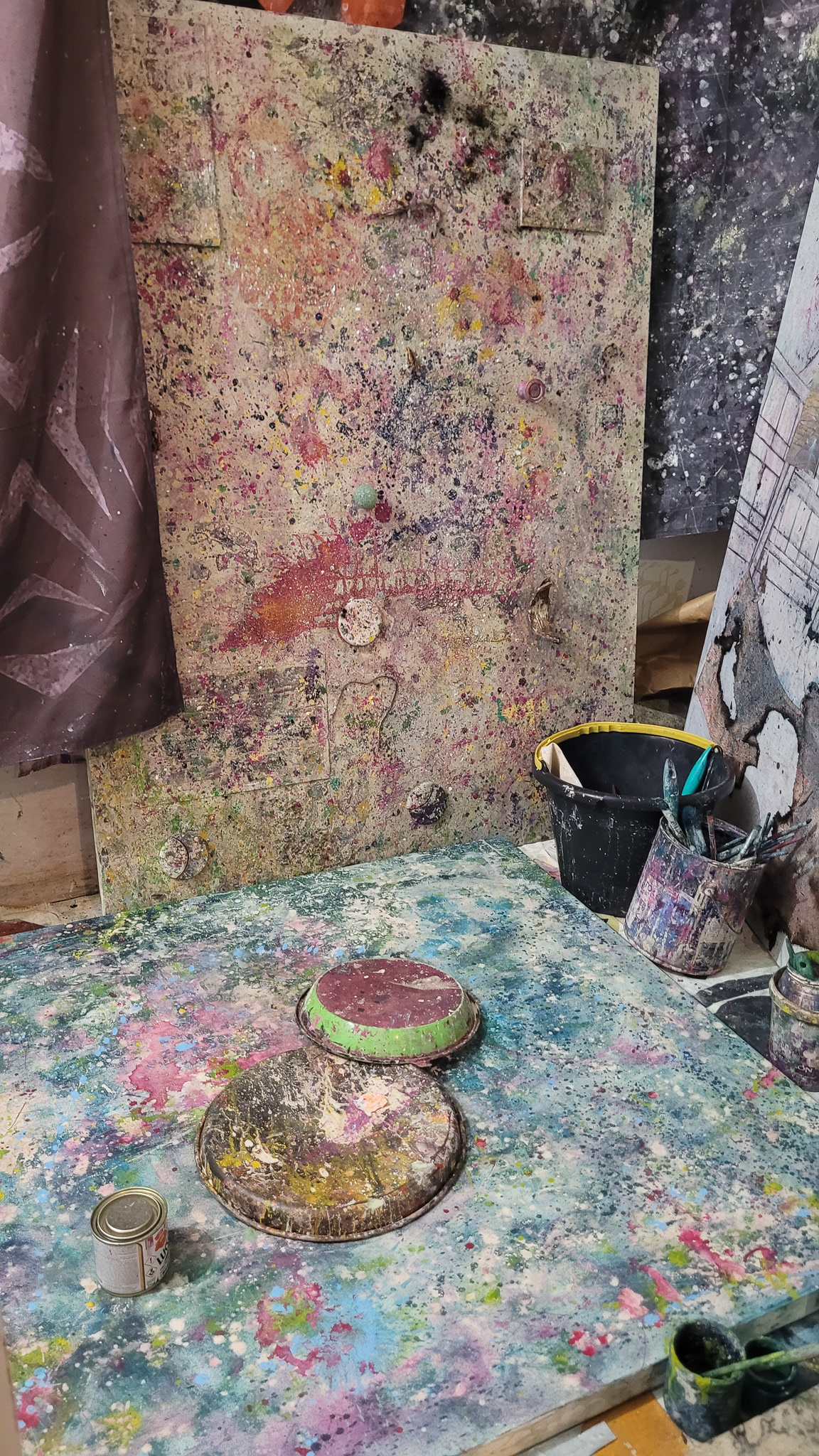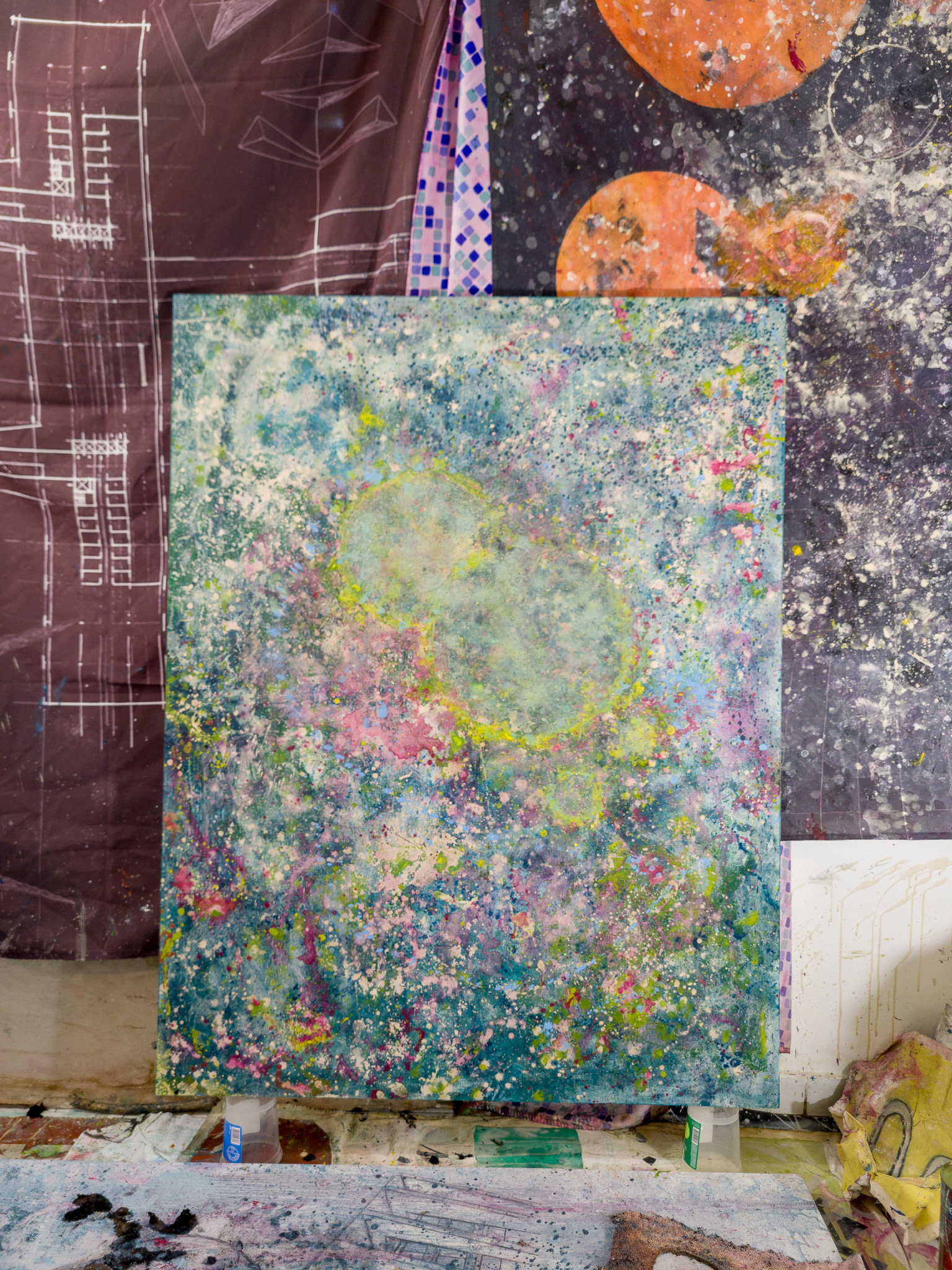 No centro do atual ciclo de pinturas, há uma paisagem por vir: uma floresta comestível organizada em mandalas geométricas. As camadas ainda úmidas anunciam esse território de transição, onde pitayas, flores de maracujá, sementes de melancia e vetores de vento se insinuam como profecias. A obra ainda pulsa, ainda respira — e talvez justamente por isso, já aponta com força para o futuro do qual se origina.
