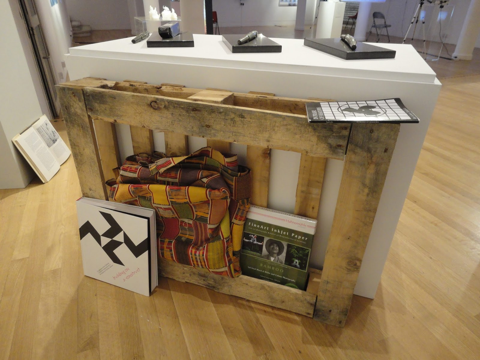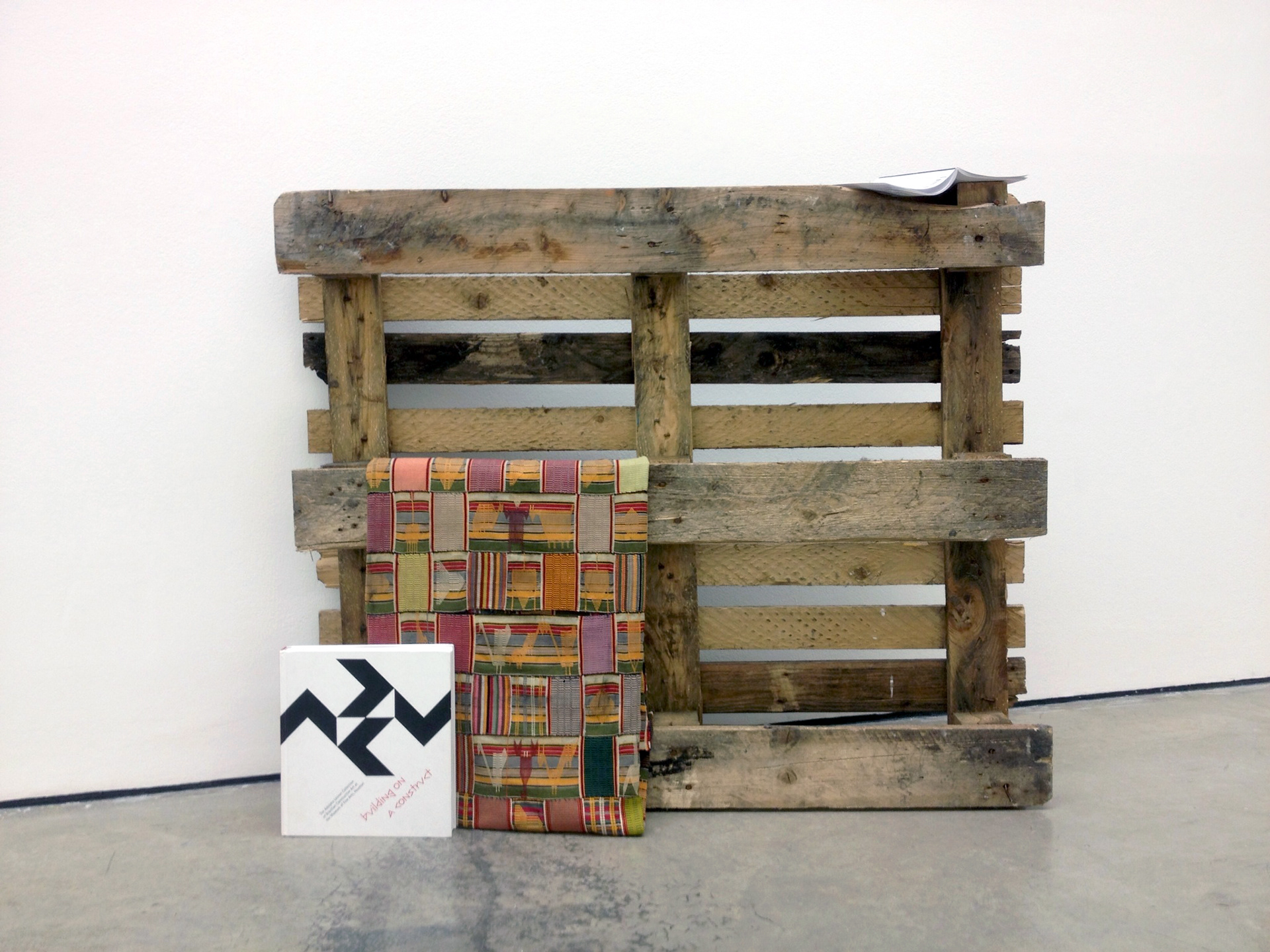 A gênese desse gesto pode ser rastreada em Tabom (2013), escultura-instalação que integra o acervo do MASP. Nela, um palete de madeira, um tecido Kente da África Ocidental e dois livros — In Praise of Shadows e Building on a Construct — compõem uma constelação de formas e histórias. O tecido Ghanense, com sua gramática gráfica coletiva, ecoa os códigos do povo Ashanti e reverbera, como observou Adriano Pedrosa, “fortes narrativas na história brasileira em torno da colonização e da escravidão”.
