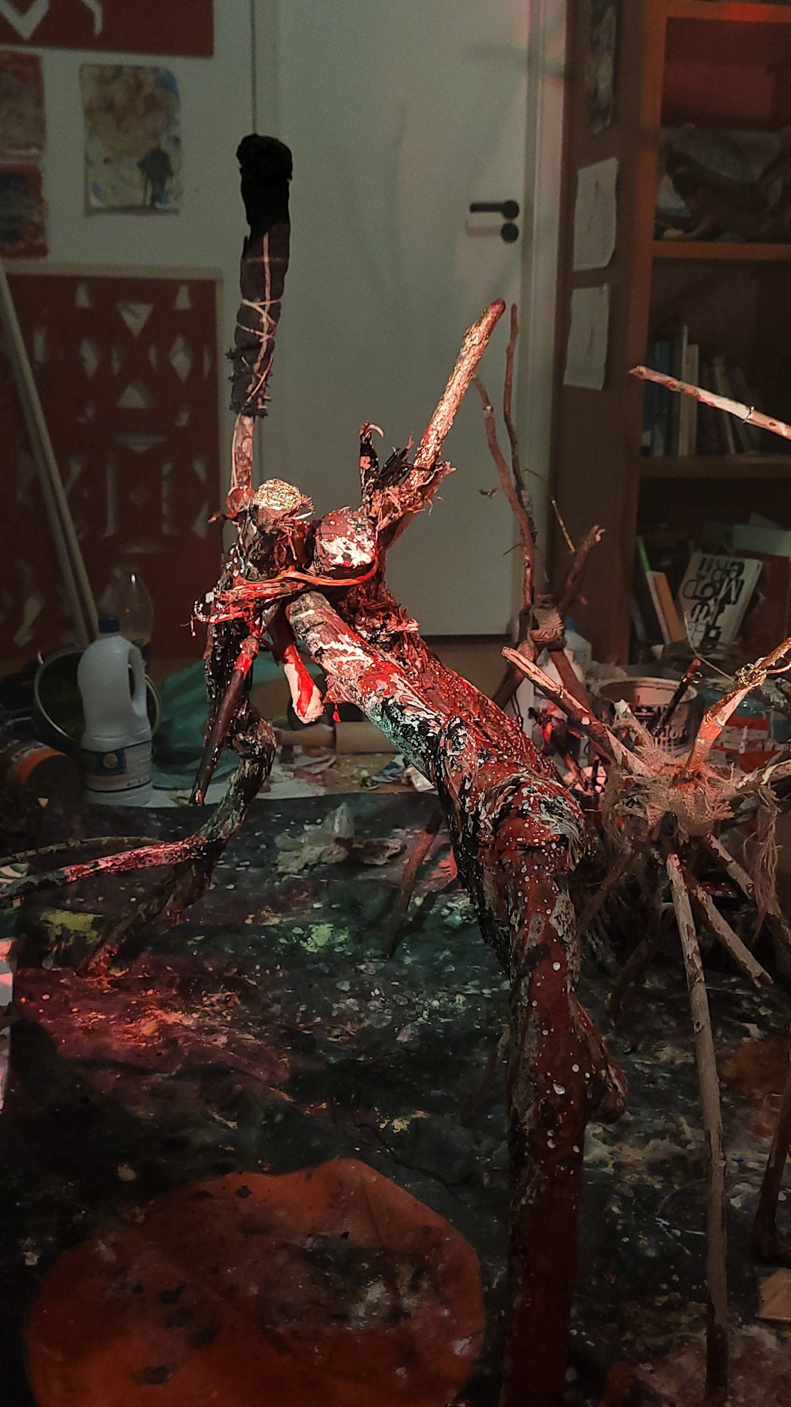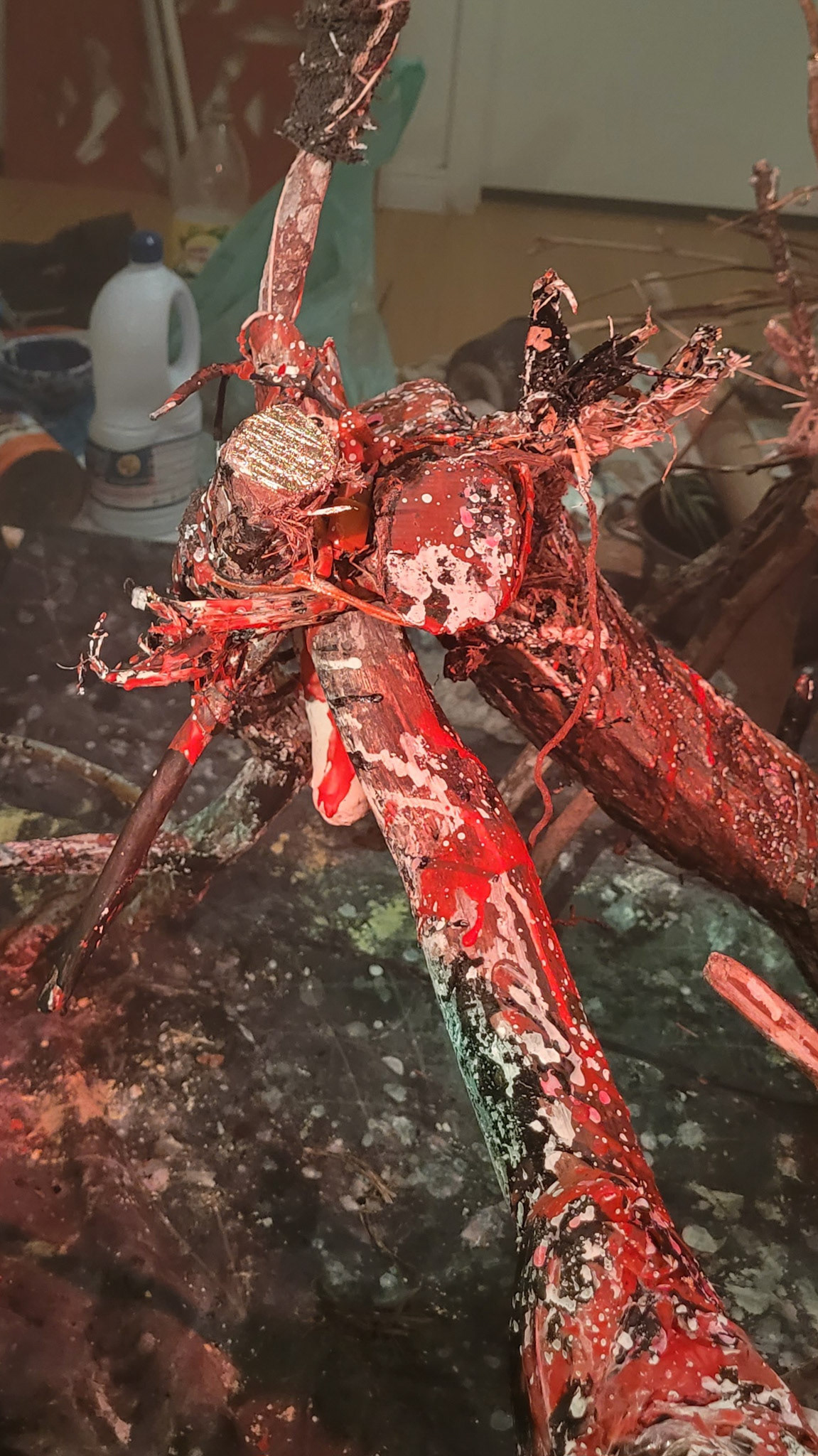 "O braço ergue-se em chamas. Uma labareda rubra e negra lambe a atmosfera, exalando um aroma carbonizado que invade o espaço como um fantasma olfativo. Neste gesto incendiário, Prometheus Vermelho e Preto desperta – uma escultura performática que arde e respira, fundindo carne e máquina, ritual e código, arte e linguagem. A cada centelha que crepita em seu membro flamejante, desenha-se um poema efêmero de fuligem no ar noturno. Sob a tintura vermelha e preta que cobre seus membros retorcidos, a criatura simbiótica carrega em si a herança de revoluções estéticas e tecnológicas, do construtivismo russo às inteligências artificiais do presente."