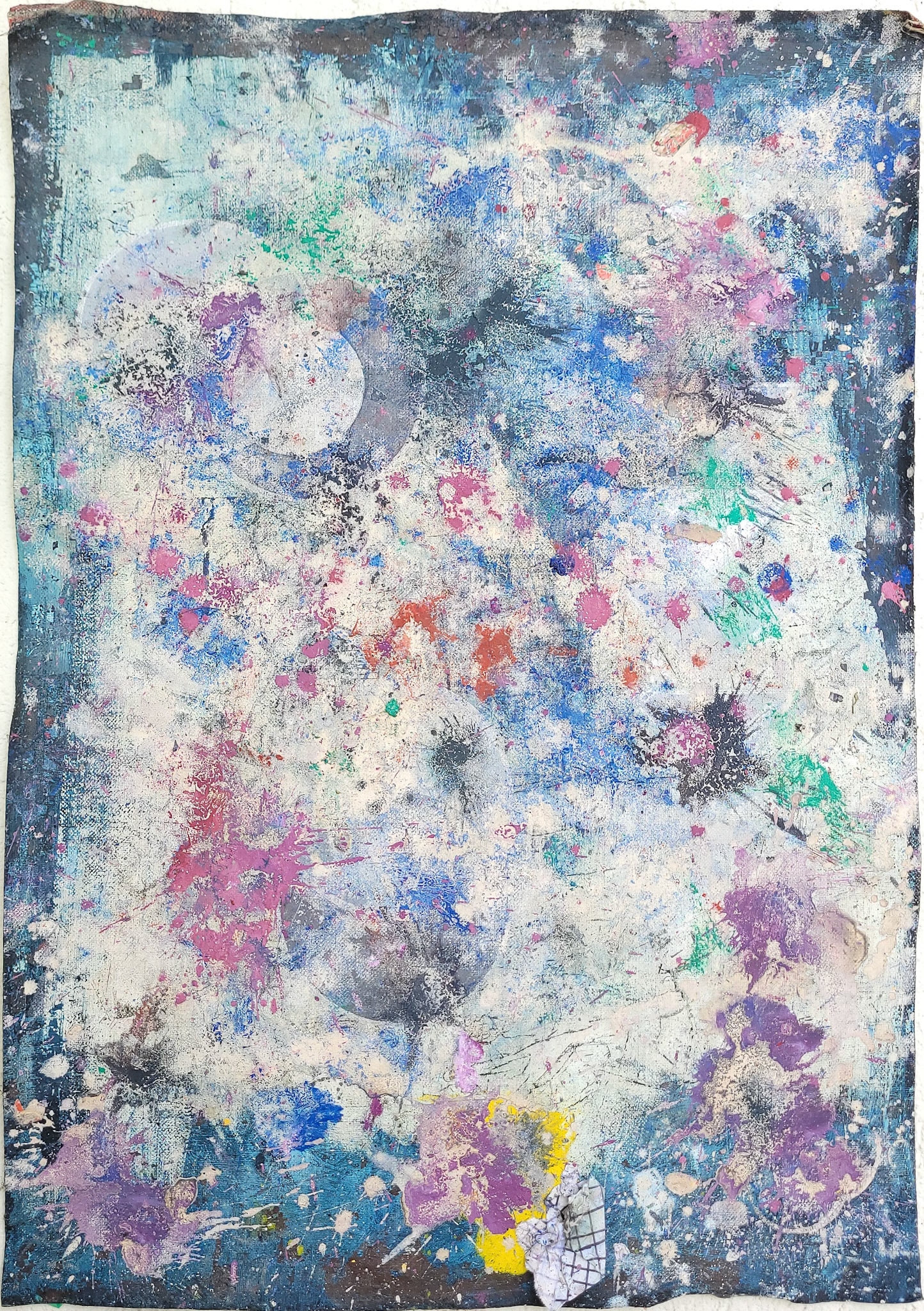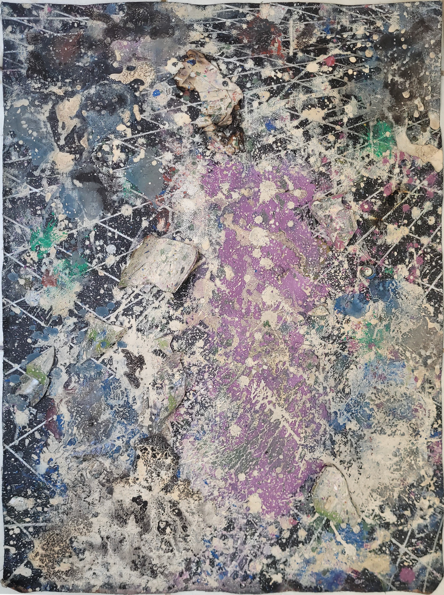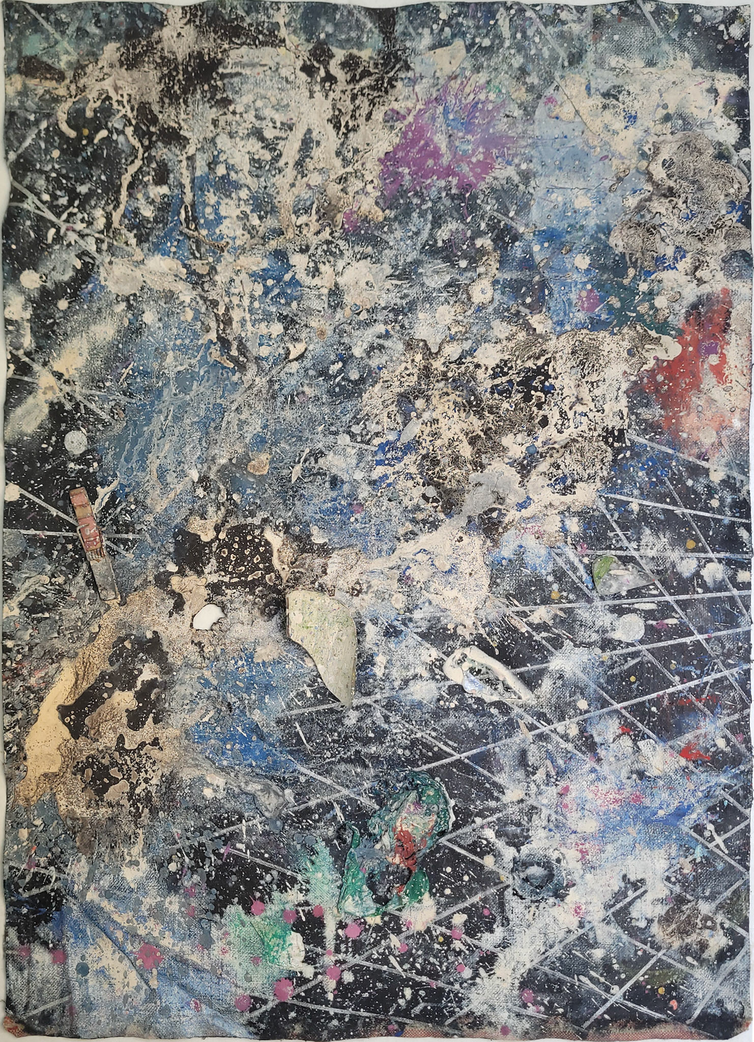 Quatro pinturas orbitam o mesmo campo gravitacional. São variações do escuro, resíduos de uma luz que foi consumida. Seus grids vibram com a memória de uma Terra futura, onde o abrigo é sempre temporário, e o traço é sempre rastro. Aqui, pintar é pactuar com o acaso — e com a auréola daquilo que queimou.