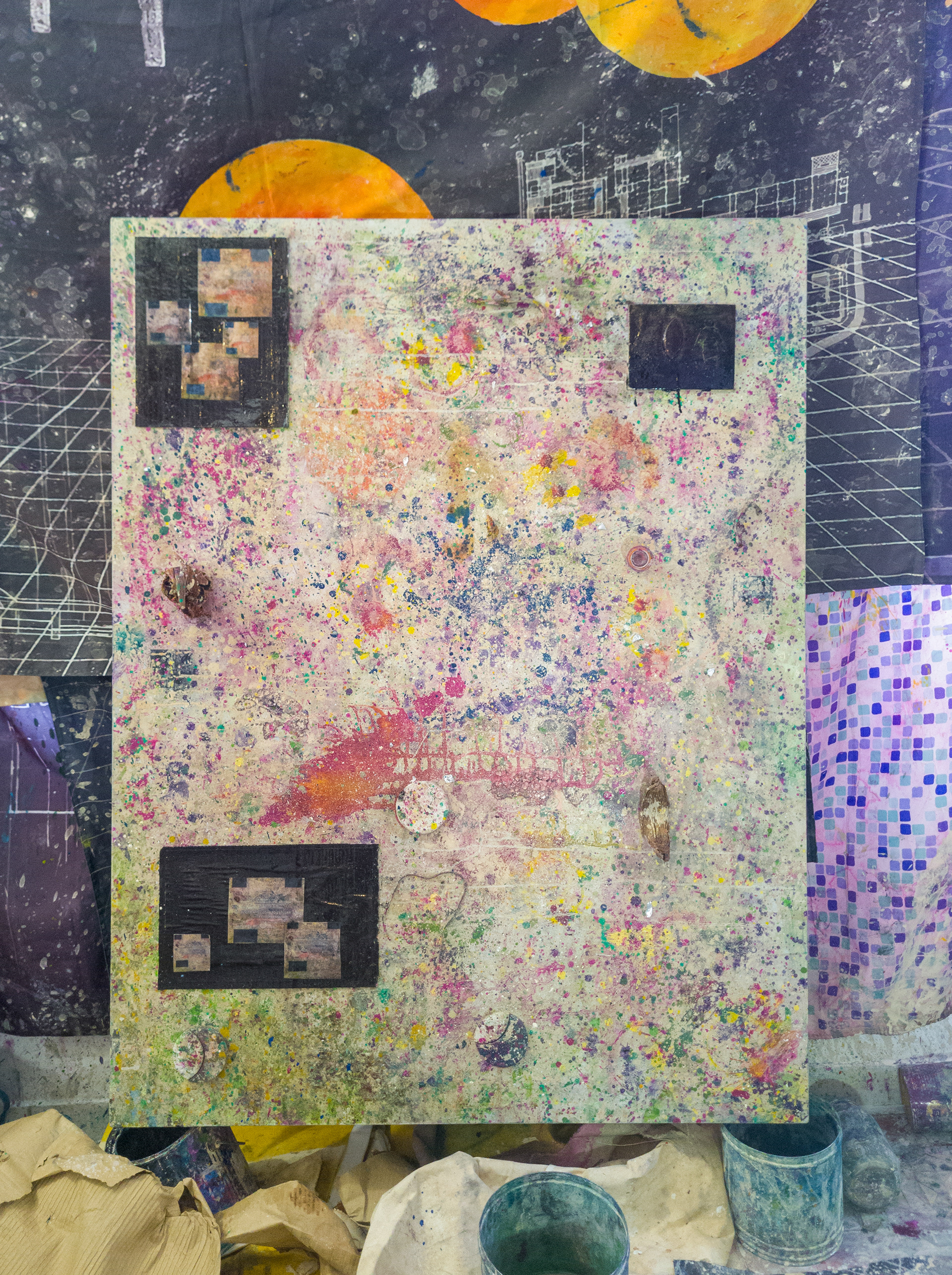 Essas imagens, impressas em papel adesivo brilhante e fundidas ao verniz, criaram uma textura entre a luz e o limo, entre as cavernas de Prometheus e os registros de uma linguagem alienígena perdida. Pensar em gotas de verniz colorido como orvalho é permitir que a tela chore em pigmentos translúcidos. Uma paisagem que exuda ruínas doces. Uma pele que secreta o tempo.
