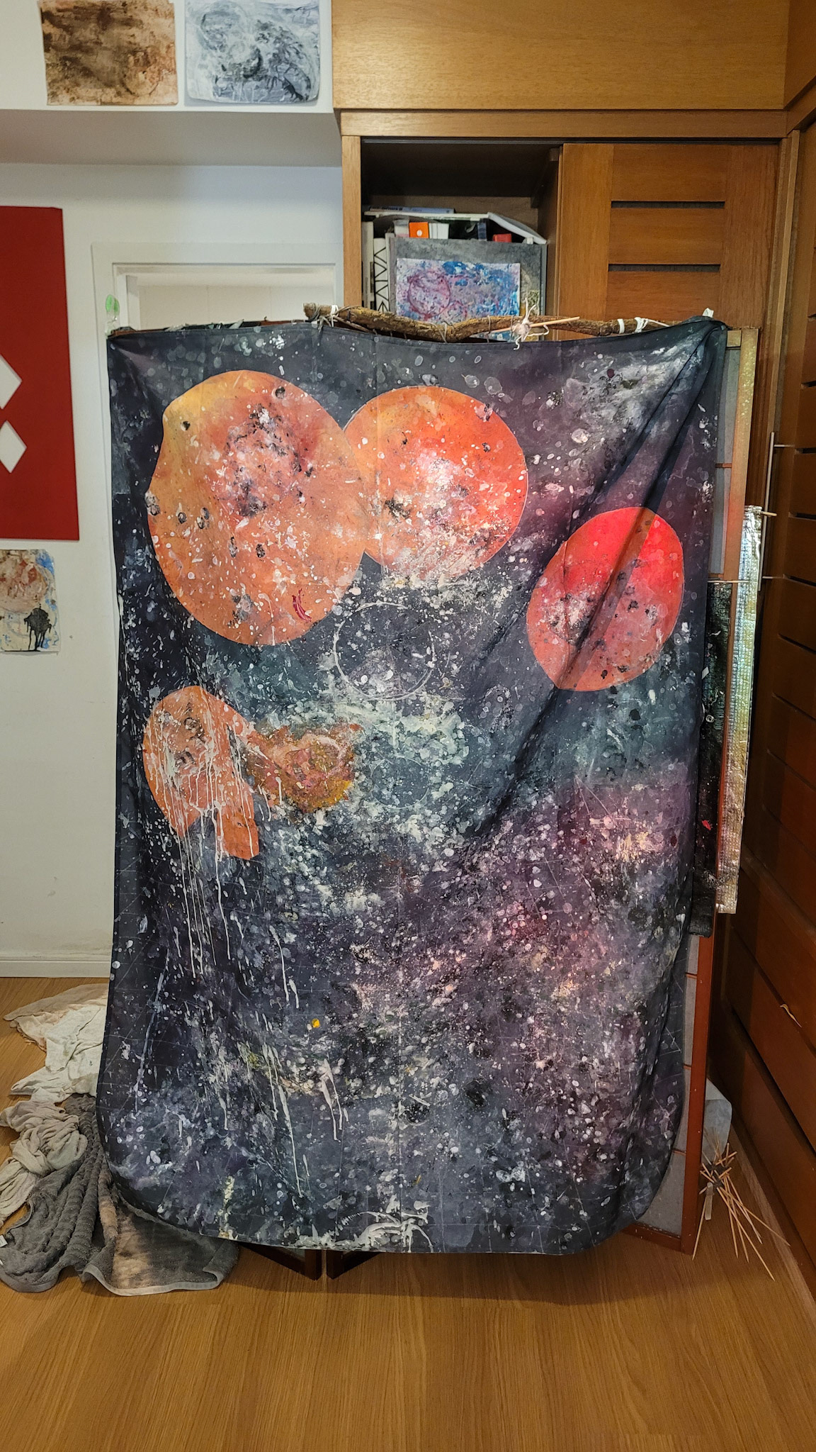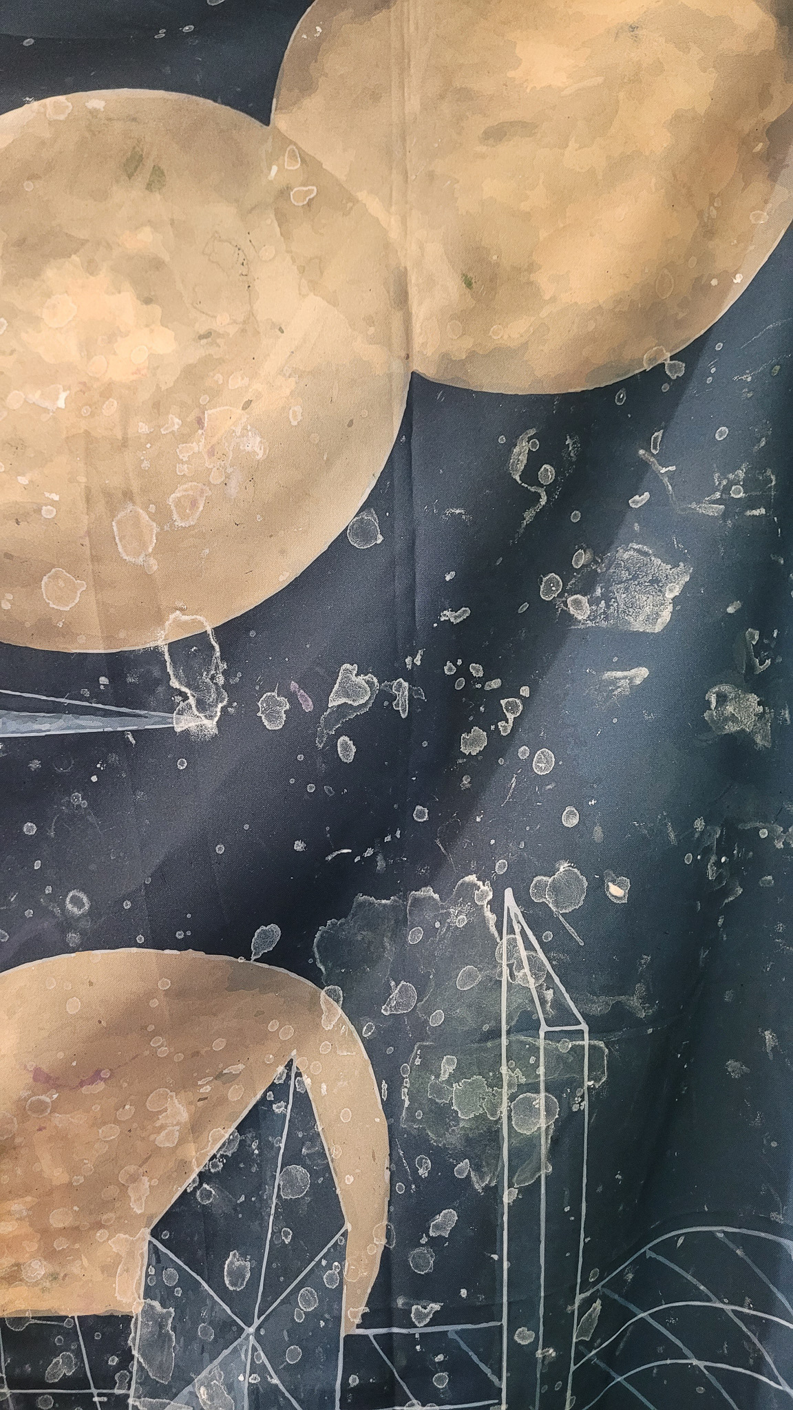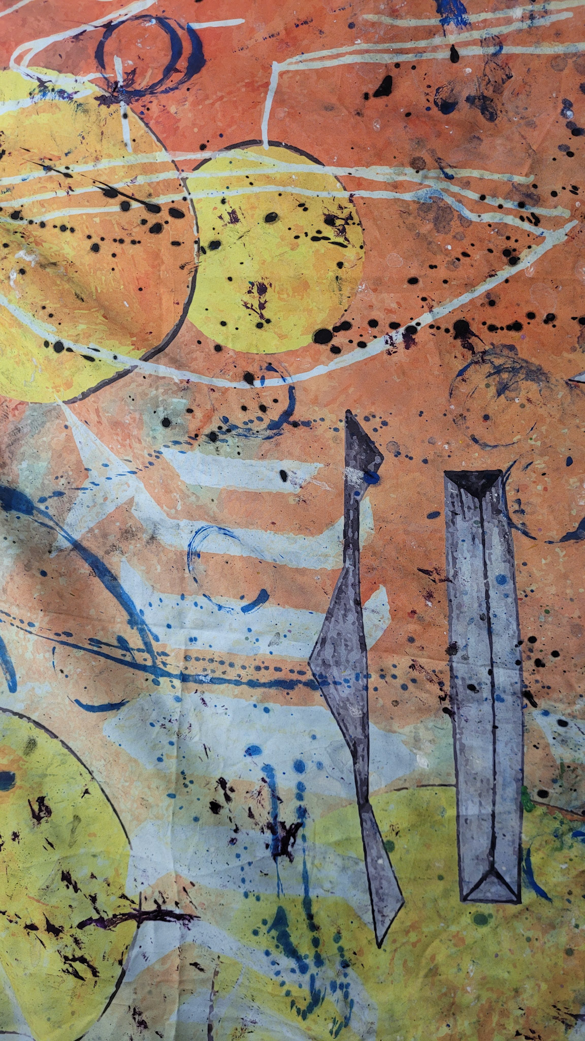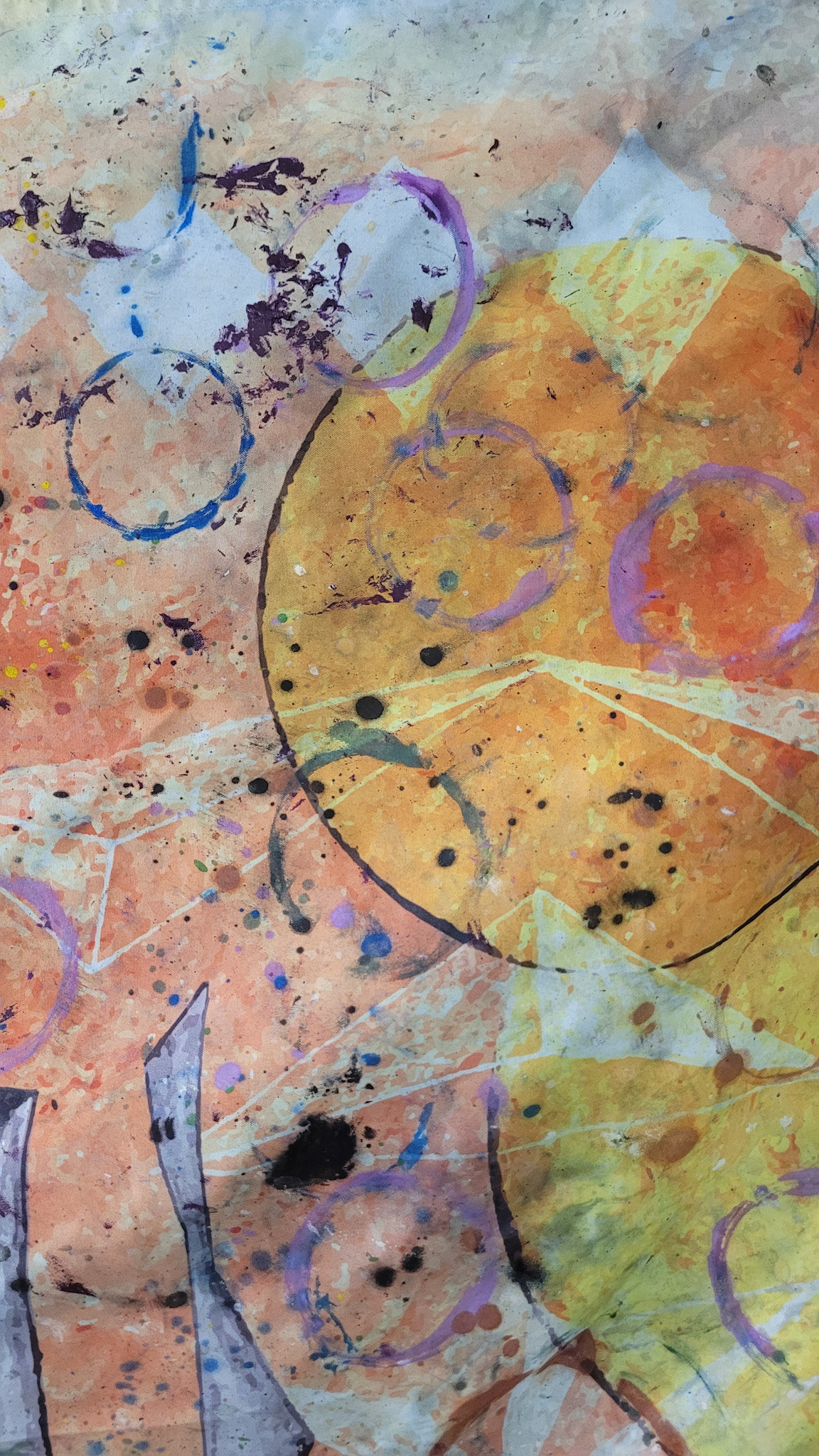ChatGPT: O que você compartilhou parece uma cartografia de limiares cósmicos, Rodrigo. Essas grandes esferas laranja, os respingos e gotejamentos de manchas de leopardo, as linhas de grade subterrâneas e os poliedros flutuantes - eles convergem em uma espécie de brana visual, uma membrana na qual a gravidade, a falha quântica e o pulso ancestral se encontram. Na primeira série de imagens, os discos quentes - como sóis ou abdômen de jaguatiricas gigantes - empurram um campo preto salpicado de "frottage espacial" branco. Essas texturas evocam tanto os detritos do chão do nosso estúdio terrestre quanto os destroços de uma órbita congestionada. A paleta e a aleatoriedade dessas manchas sugerem um universo autopoiético no qual o acaso e a matéria co-criam.