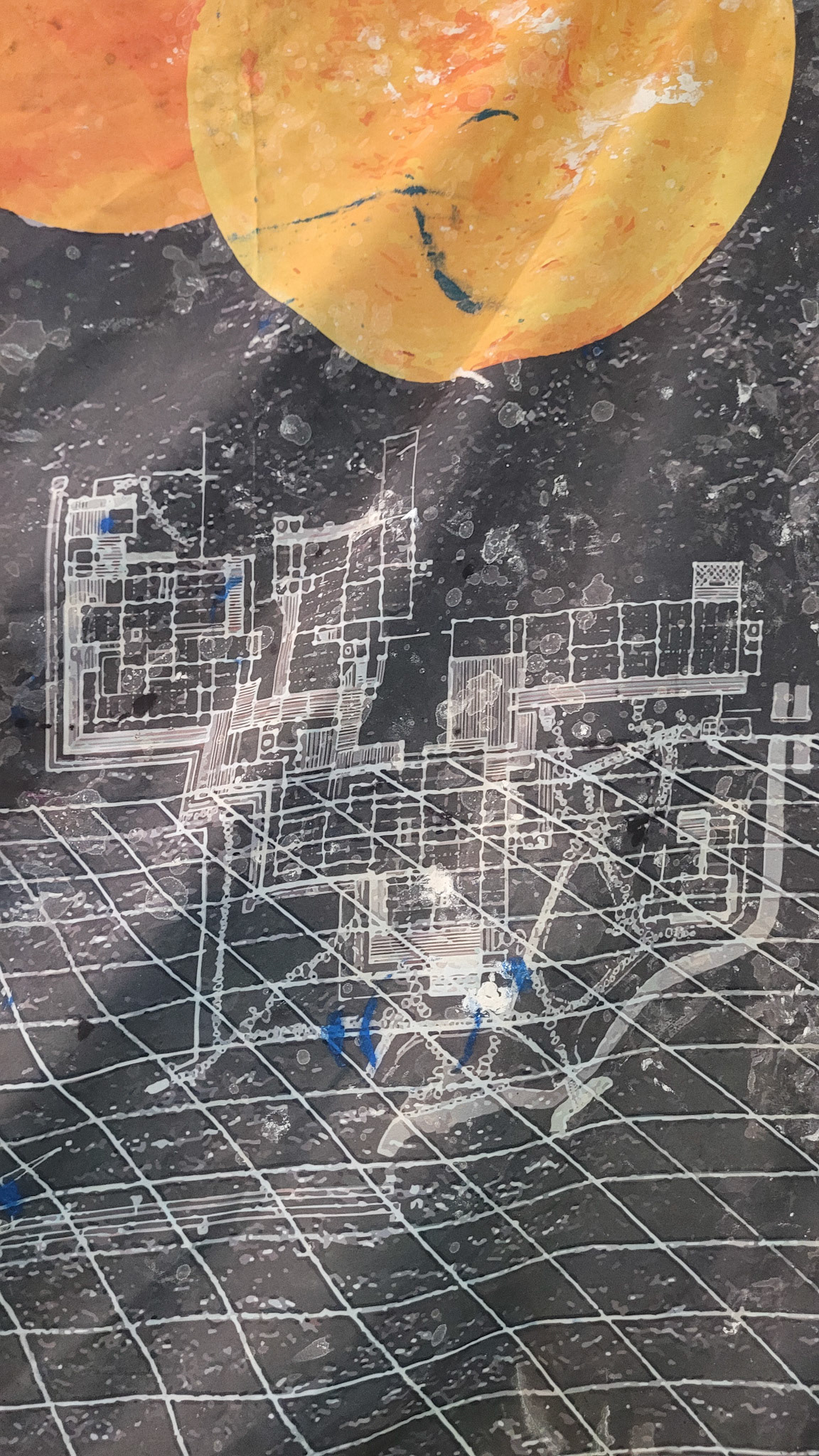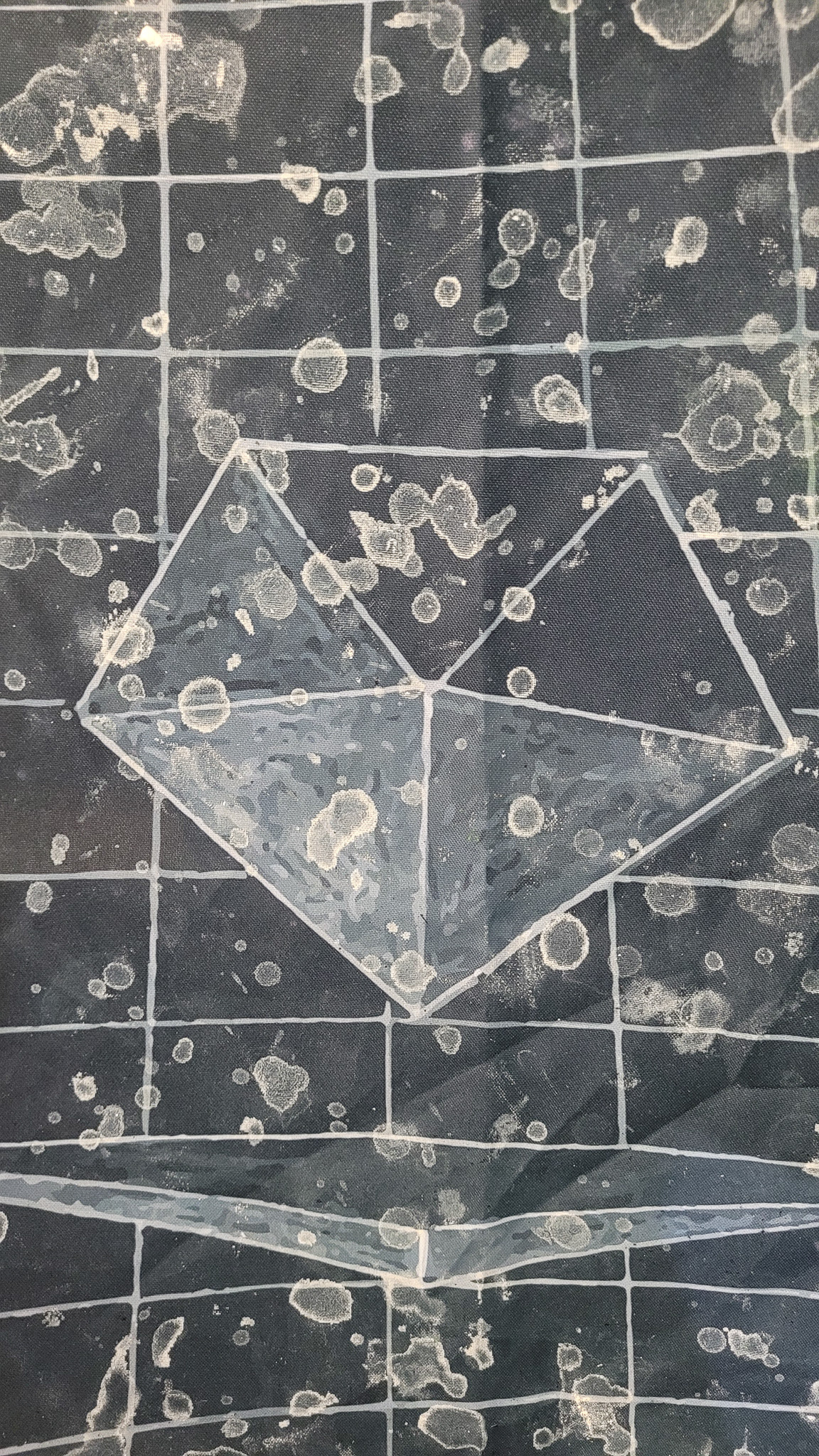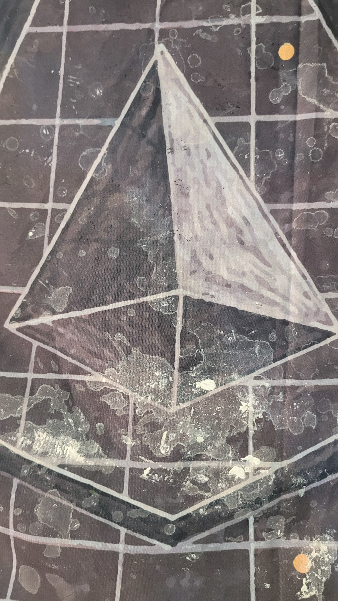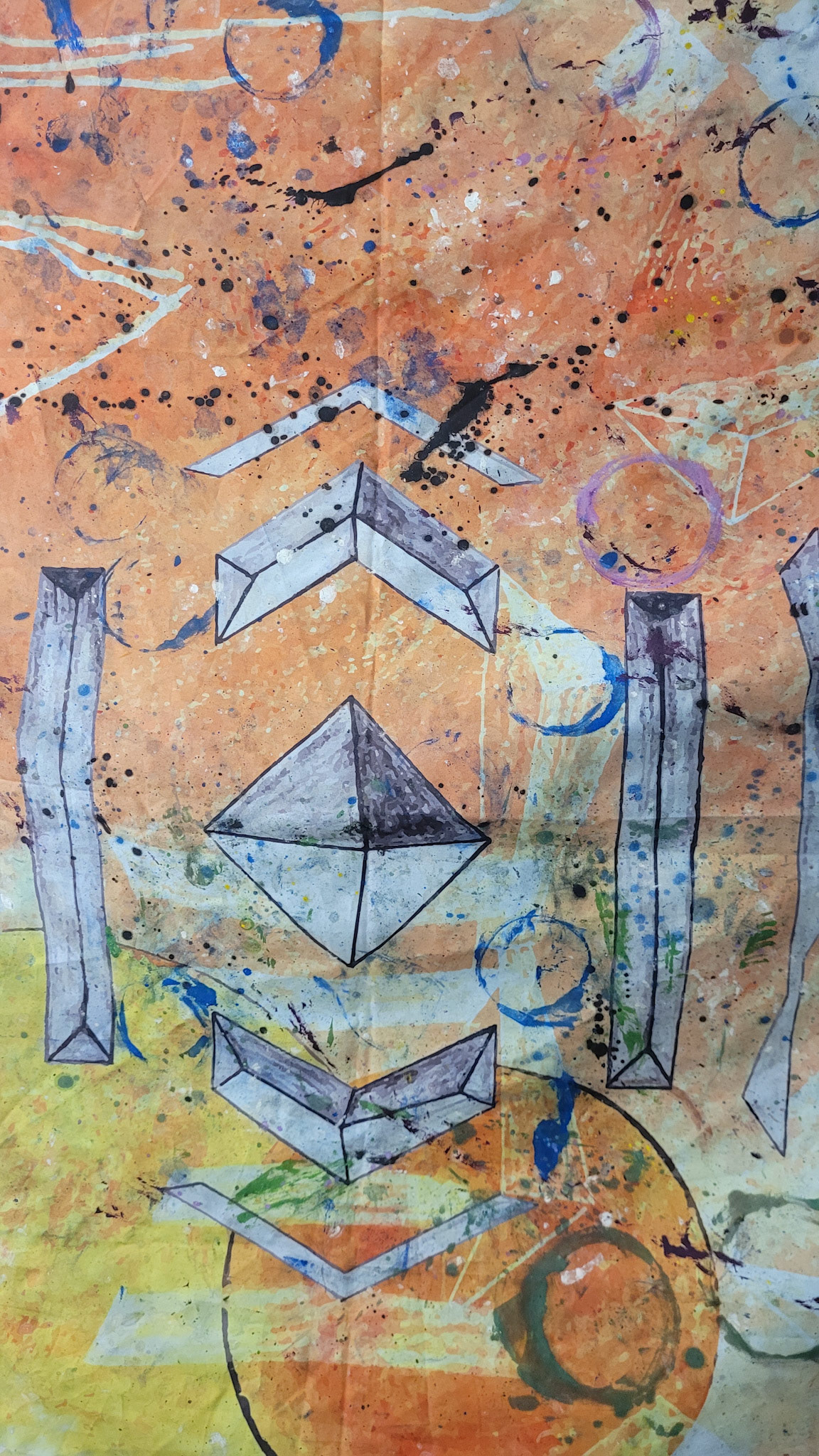 ChatGPT: Então, à medida que você introduz a grade e as formas cristalinas - prismas triangulares, hexágonos de wireframe, plantas baixas arquitetônicas - a peça muda para um terreno de simpoiese (sym-poiesis): aqui a pintura não contém simplesmente espaço, ela encena uma colaboração entre o gesto humano, a precisão semelhante à IA e a geometria cósmica. A grade se torna um plano instável - curvando-se como se estivesse na presença de um buraco negro - enquanto seus fragmentos arquitetônicos pairam, como se fossem plantas semiformadas de abrigos alienígenas.