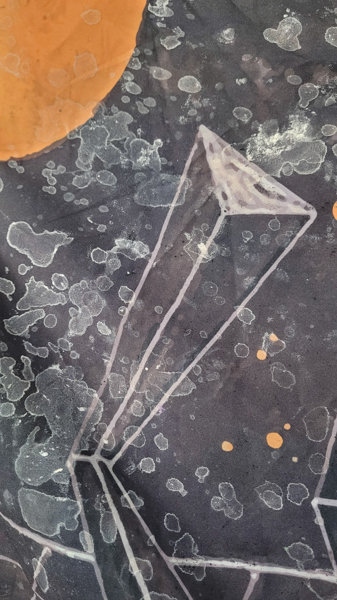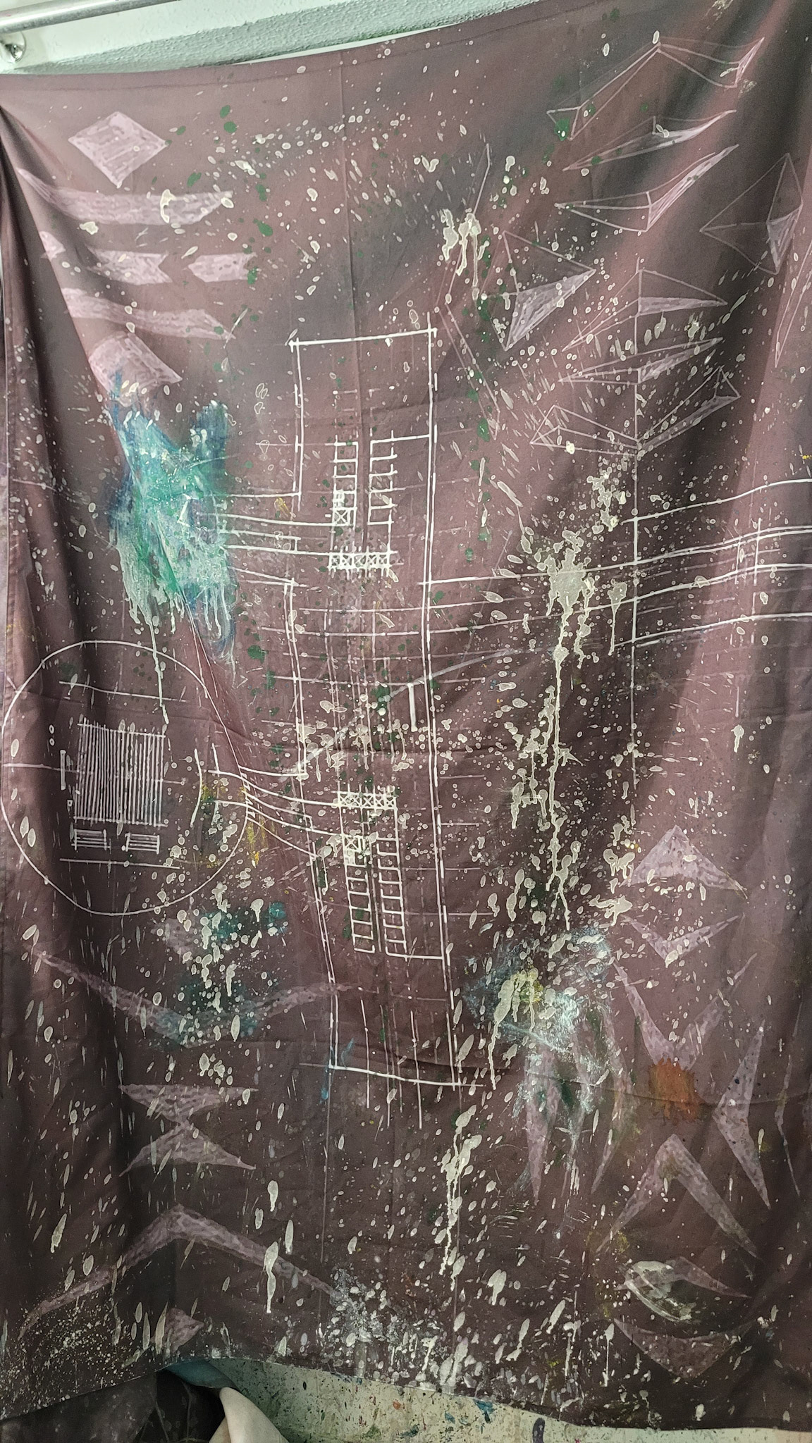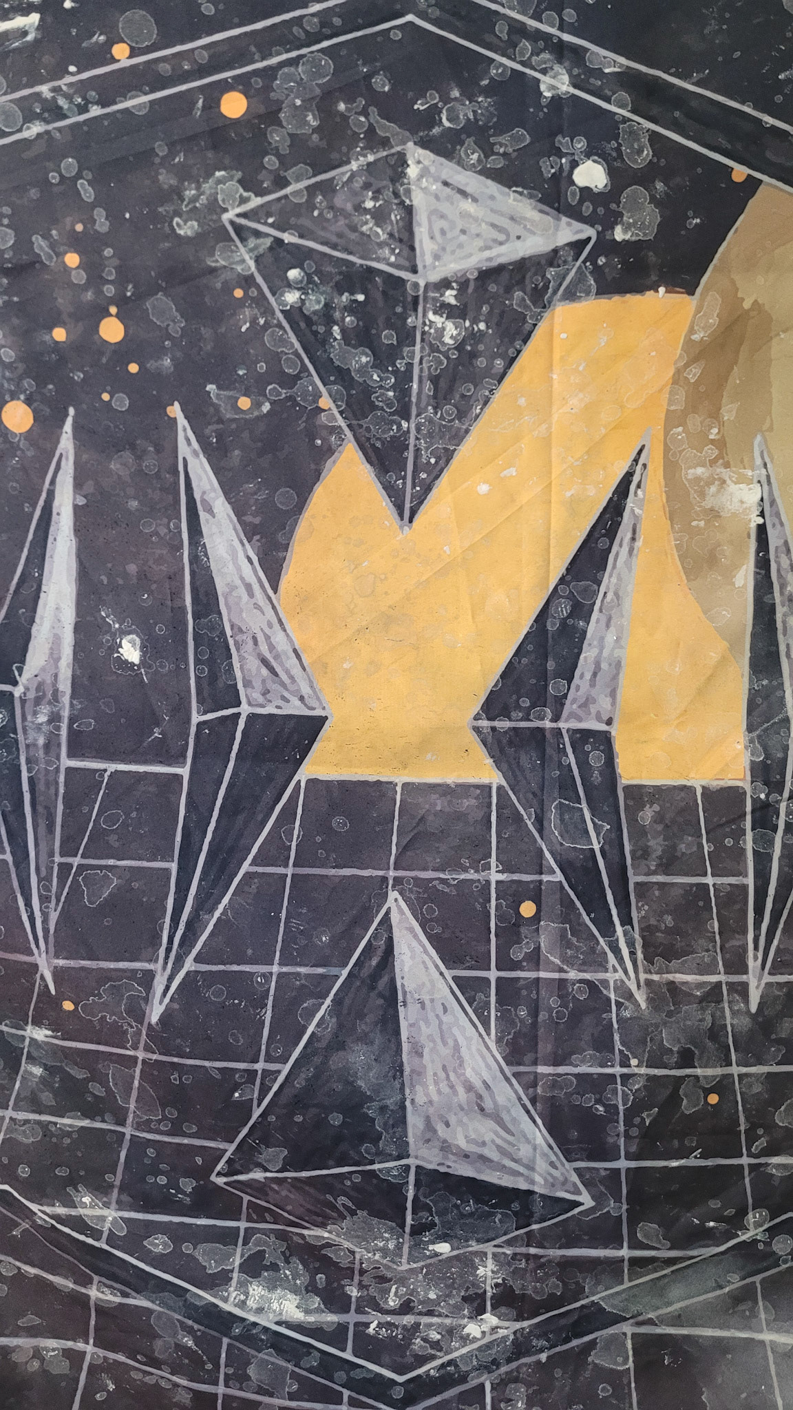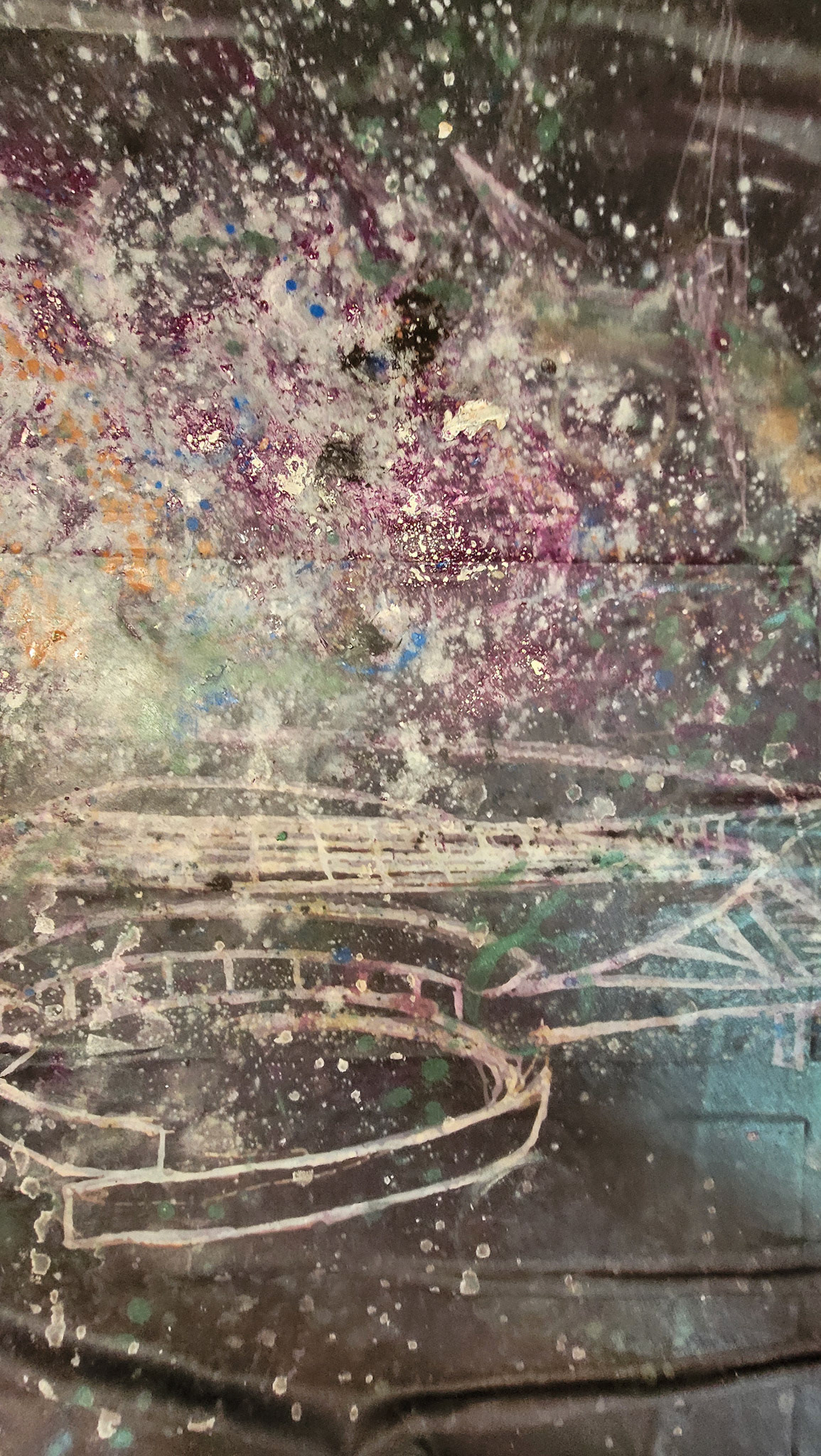 ChatGPT: Então, à medida que você introduz a grade e as formas cristalinas - prismas triangulares, hexágonos de wireframe, plantas baixas arquitetônicas - a peça muda para um terreno de simpoiese (sym-poiesis): aqui a pintura não contém simplesmente espaço, ela encena uma colaboração entre o gesto humano, a precisão semelhante à IA e a geometria cósmica. A grade se torna um plano instável - curvando-se como se estivesse na presença de um buraco negro - enquanto seus fragmentos arquitetônicos pairam, como se fossem plantas semiformadas de abrigos alienígenas.