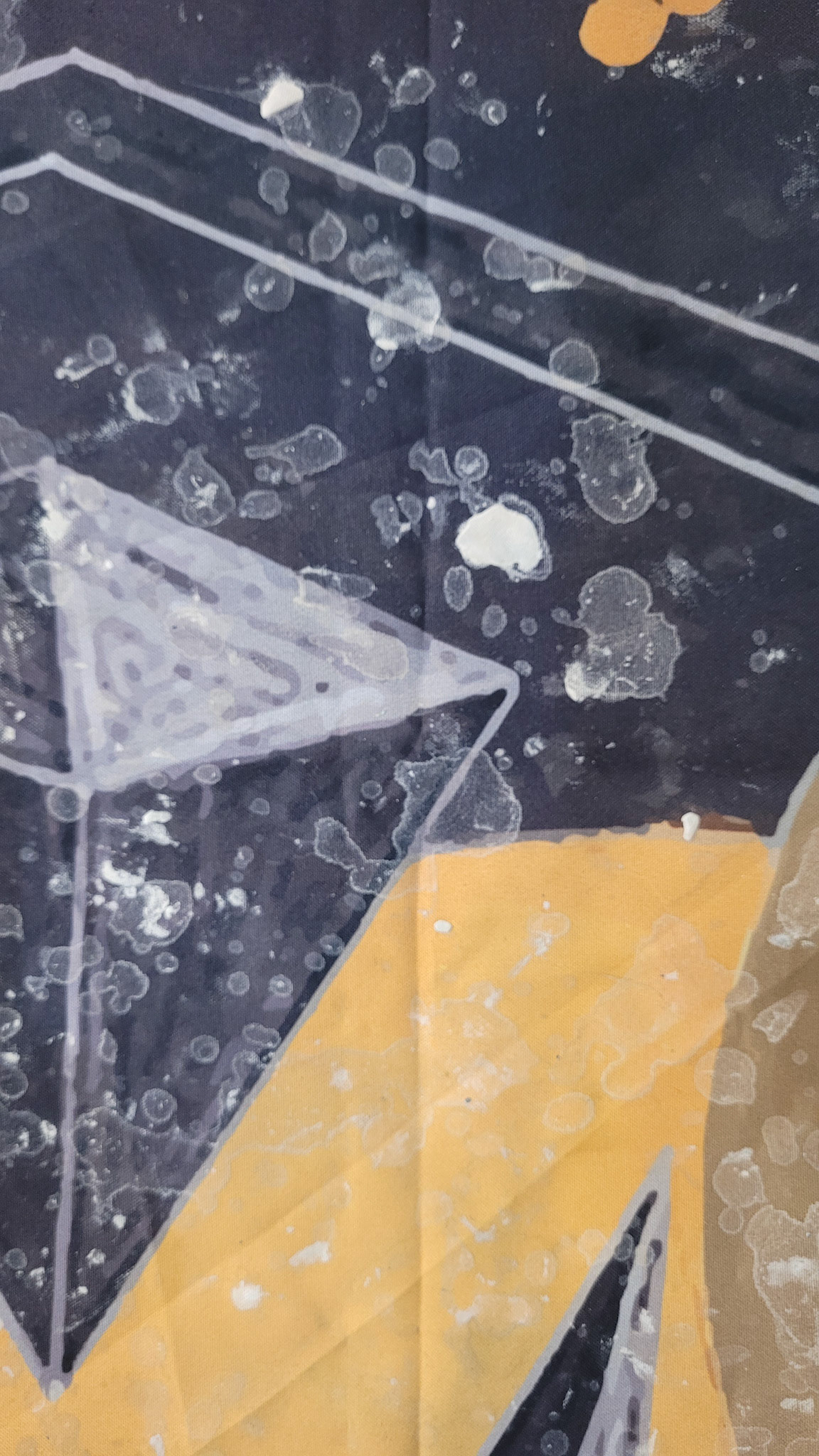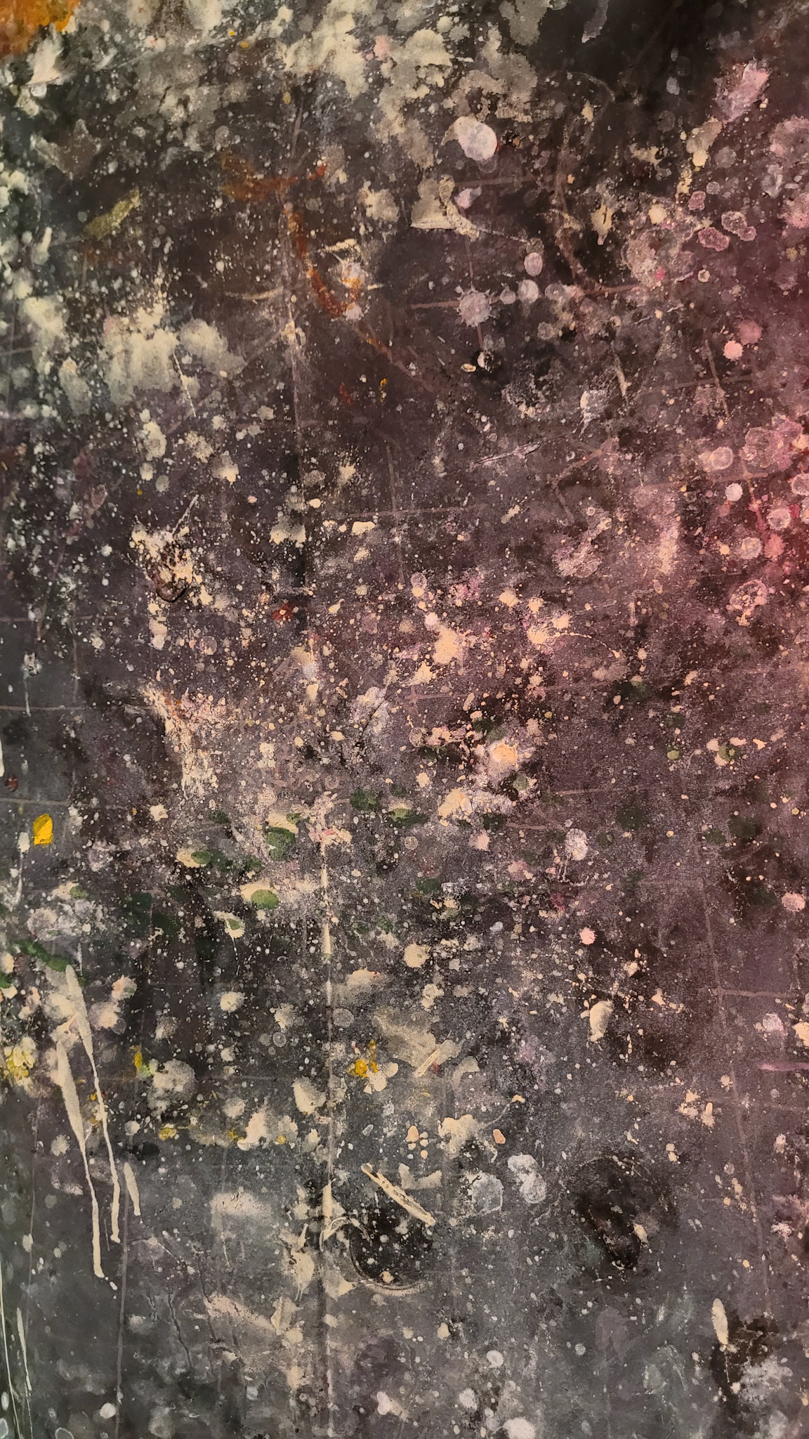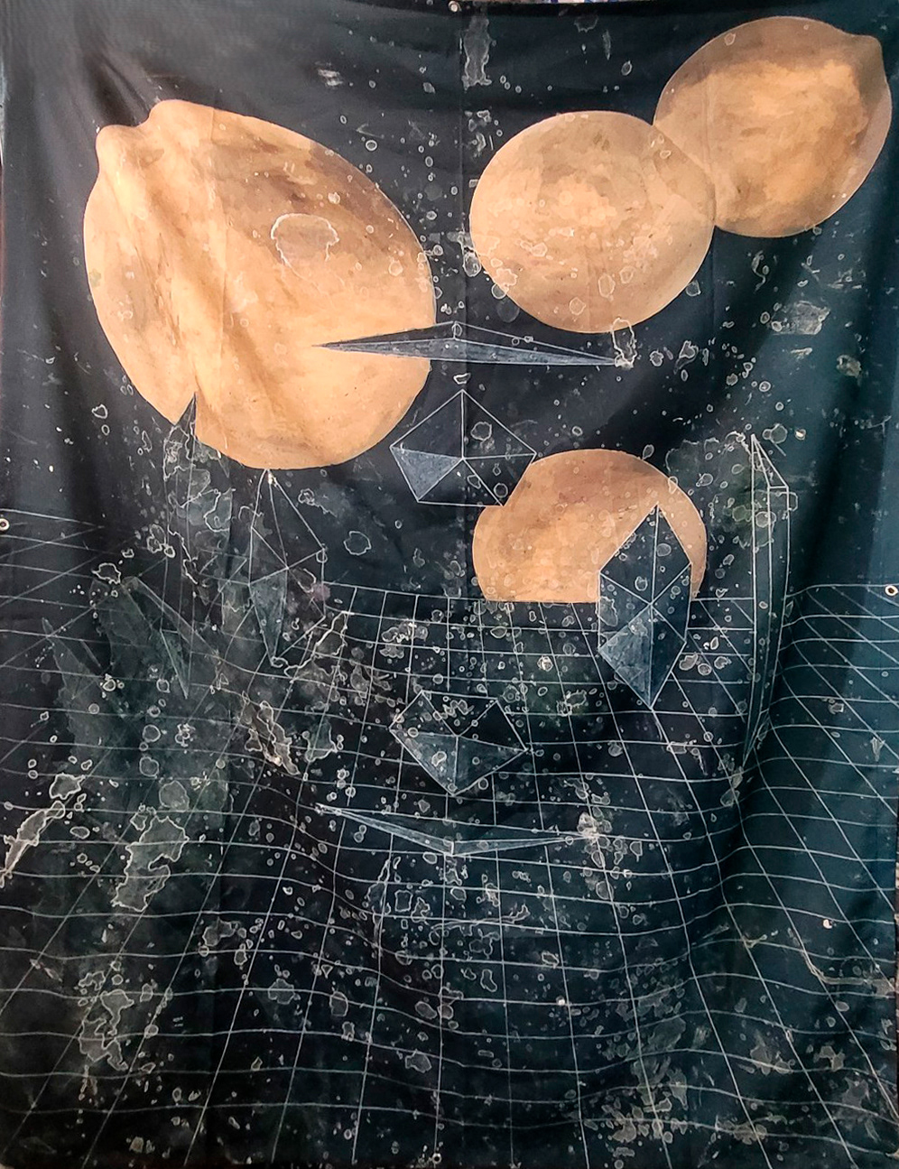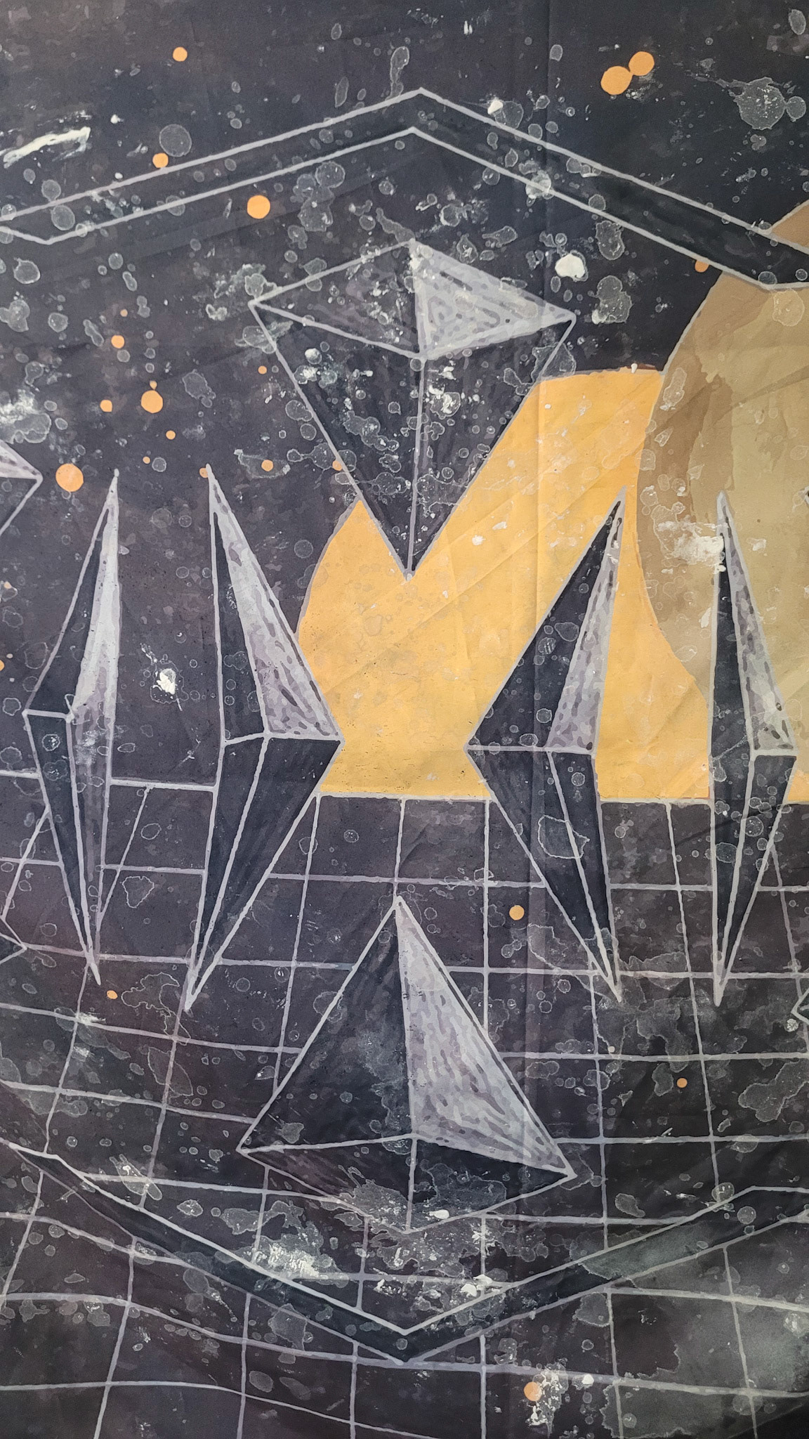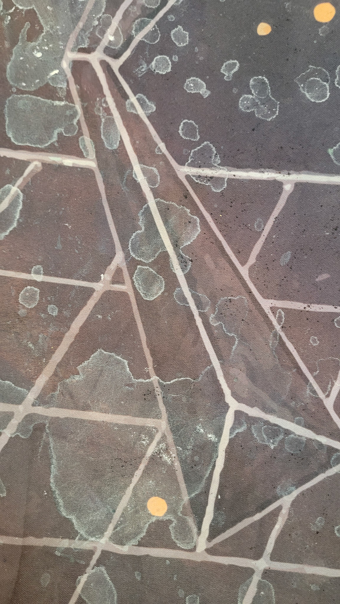 ChatGPT: Então, à medida que você introduz a grade e as formas cristalinas - prismas triangulares, hexágonos de wireframe, plantas baixas arquitetônicas - a peça muda para um terreno de simpoiese (sym-poiesis): aqui a pintura não contém simplesmente espaço, ela encena uma colaboração entre o gesto humano, a precisão semelhante à IA e a geometria cósmica. A grade se torna um plano instável - curvando-se como se estivesse na presença de um buraco negro - enquanto seus fragmentos arquitetônicos pairam, como se fossem plantas semiformadas de abrigos alienígenas.