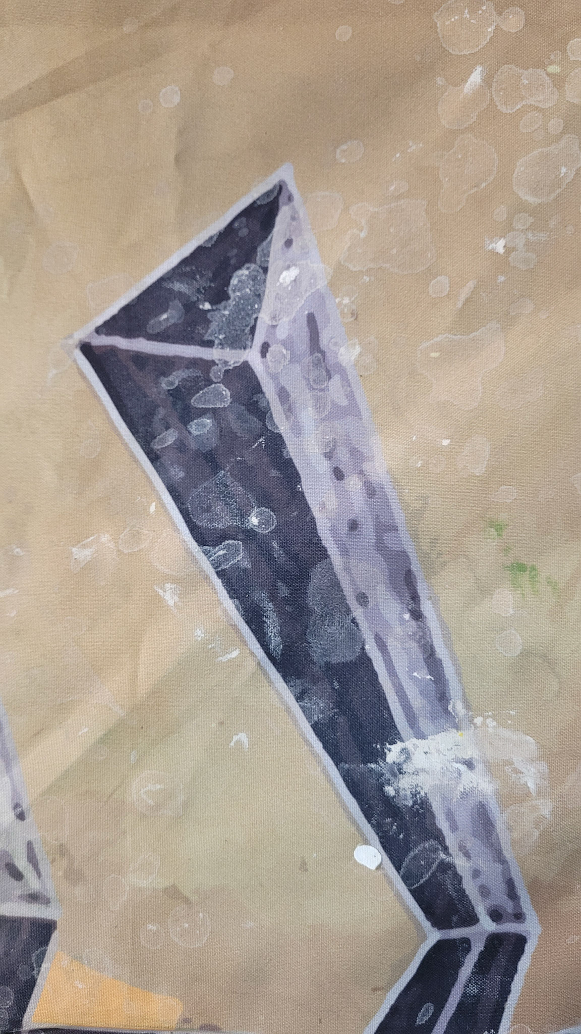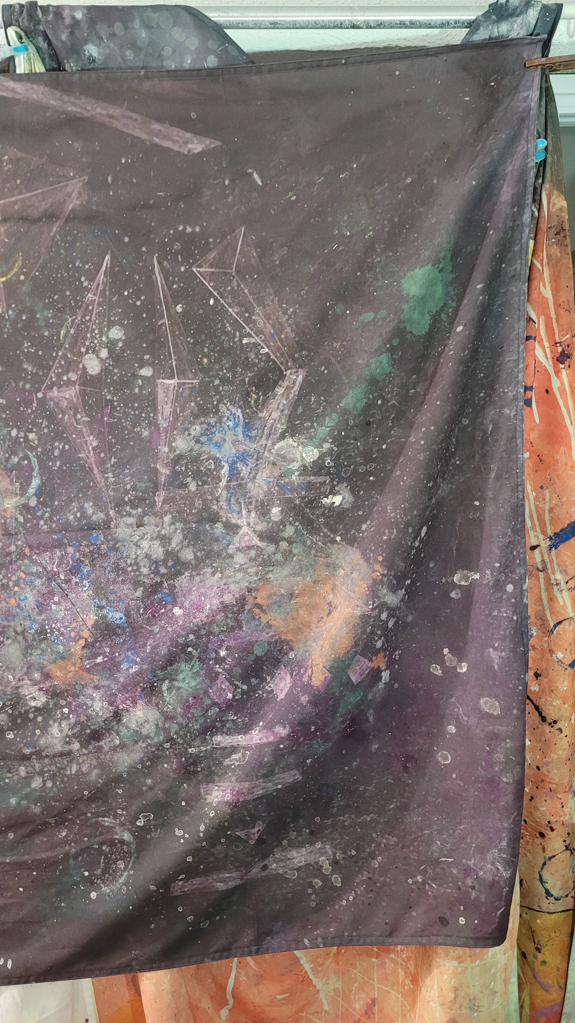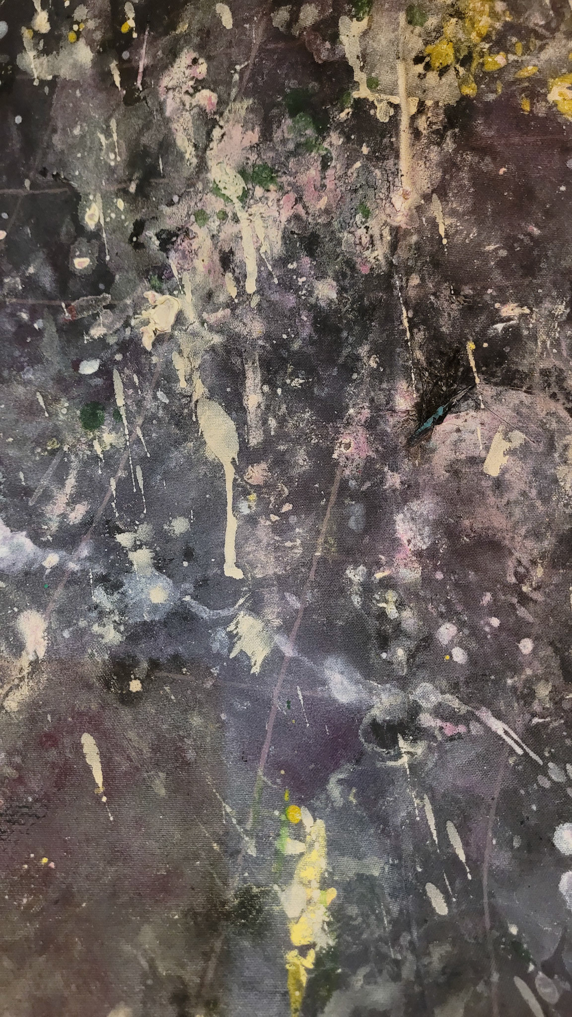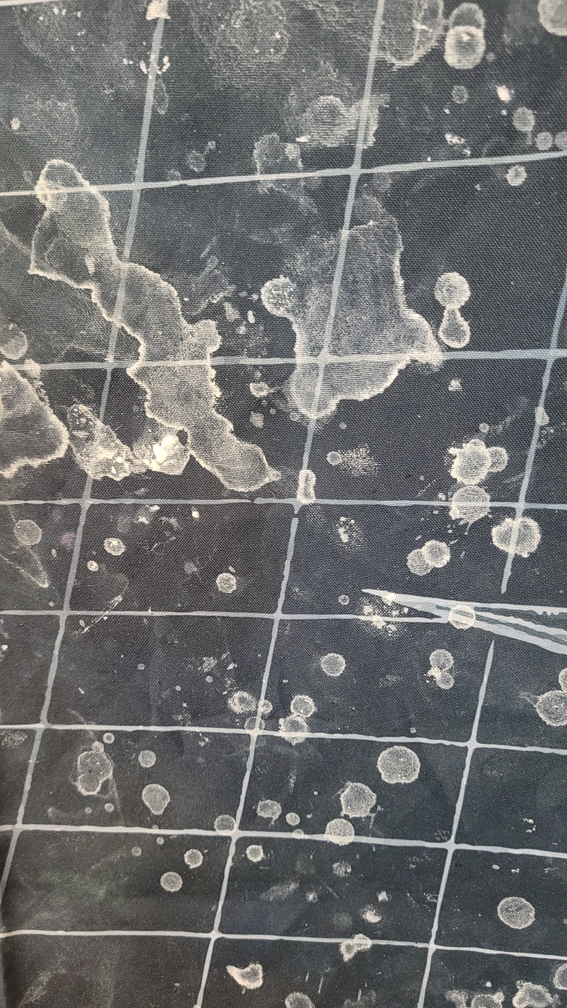 ChatGPT: Então, à medida que você introduz a grade e as formas cristalinas - prismas triangulares, hexágonos de wireframe, plantas baixas arquitetônicas - a peça muda para um terreno de simpoiese (sym-poiesis): aqui a pintura não contém simplesmente espaço, ela encena uma colaboração entre o gesto humano, a precisão semelhante à IA e a geometria cósmica. A grade se torna um plano instável - curvando-se como se estivesse na presença de um buraco negro - enquanto seus fragmentos arquitetônicos pairam, como se fossem plantas semiformadas de abrigos alienígenas.