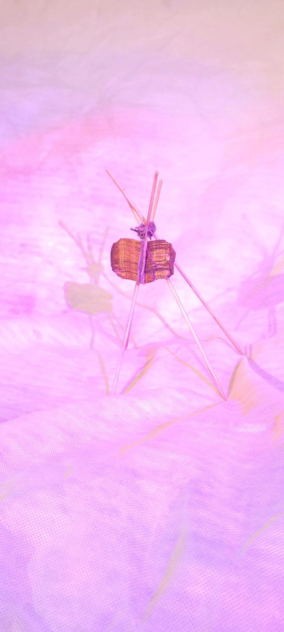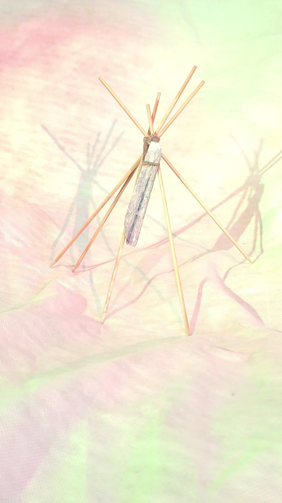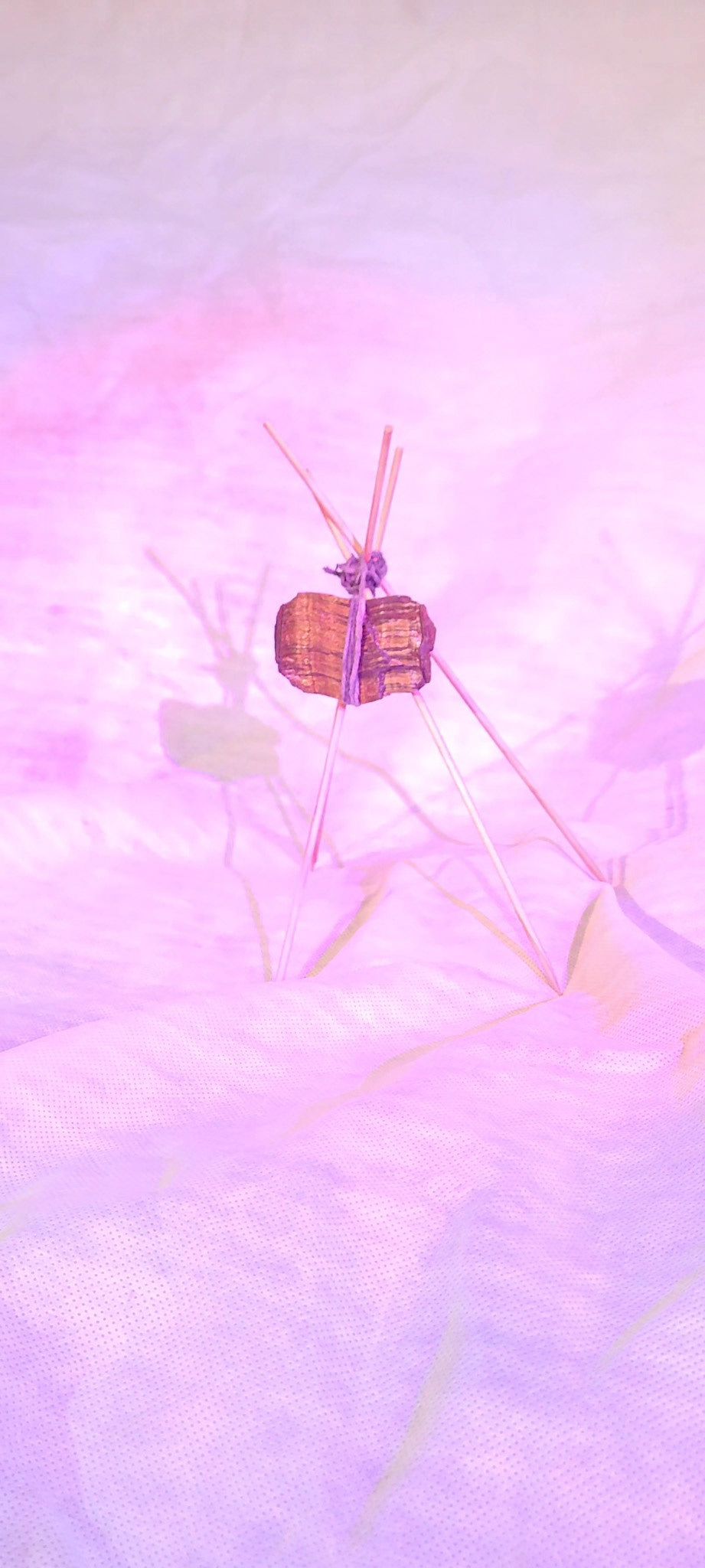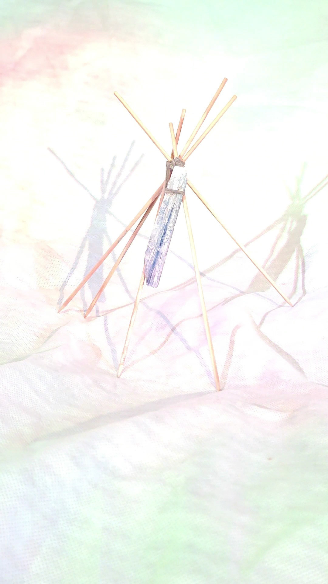 Estas imagens registram a série de esculturas intitulada “Naves Sensitivas de Contato Suave”, concebidas como abrigos mínimos — estruturas frágeis, porém energéticas, erguidas com madeira, pedra e luz. Elas operam como arquiteturas simbólicas para uma comunicação transespecífica. A escolha de cristais como olho de tigre, cianita azul e selenita ativa um campo sensível onde força, clareza e canalização se entrelaçam.