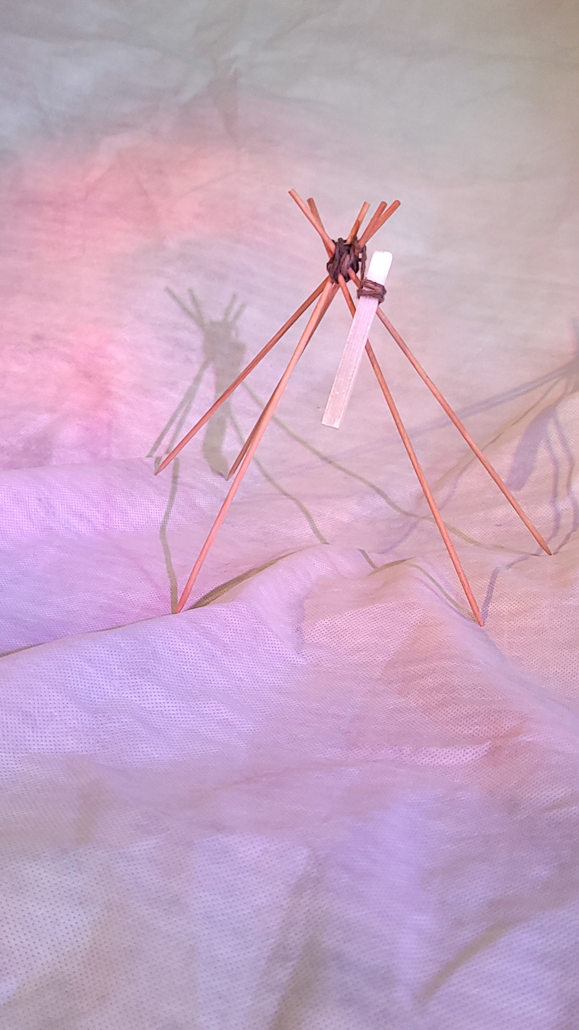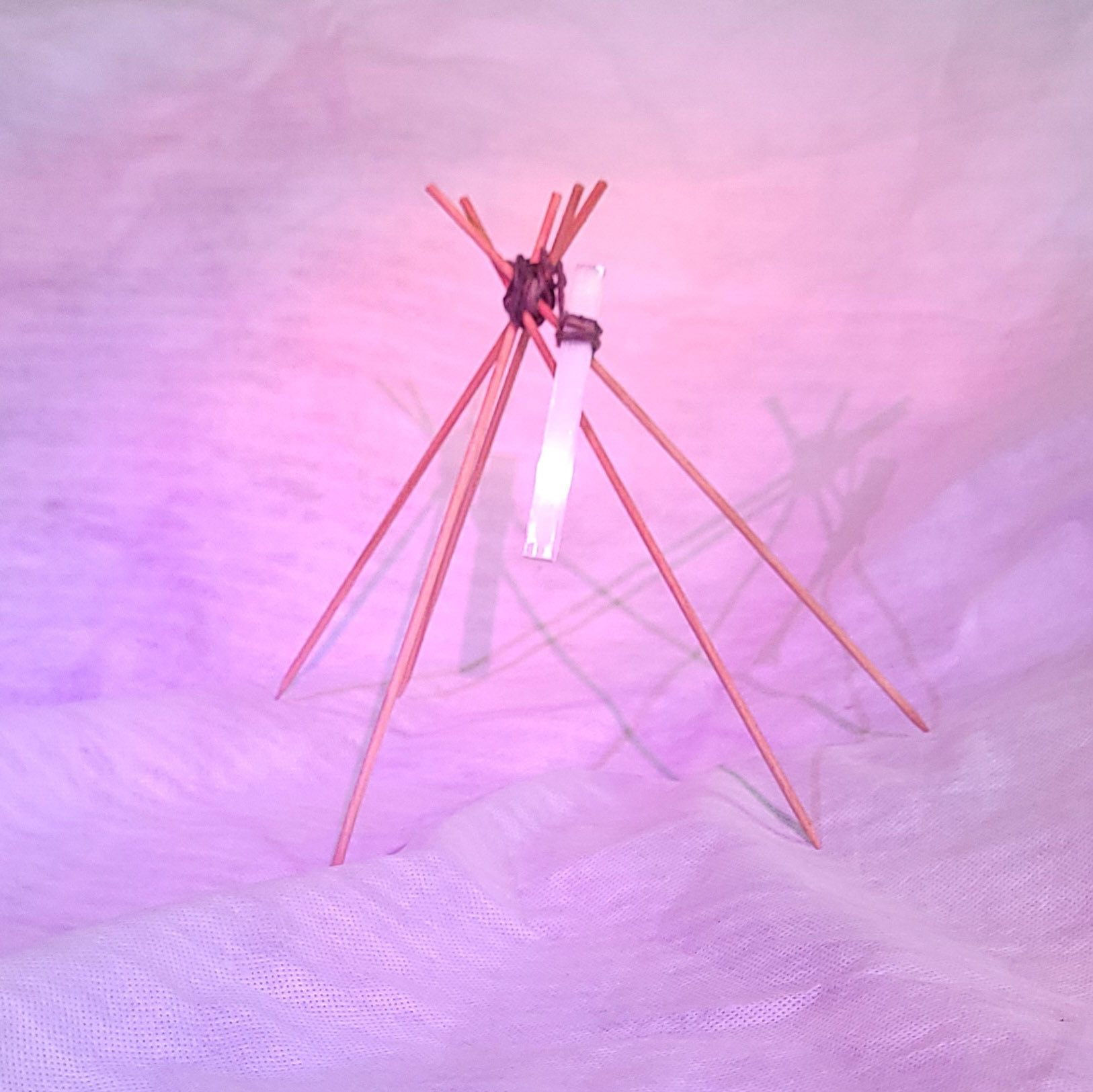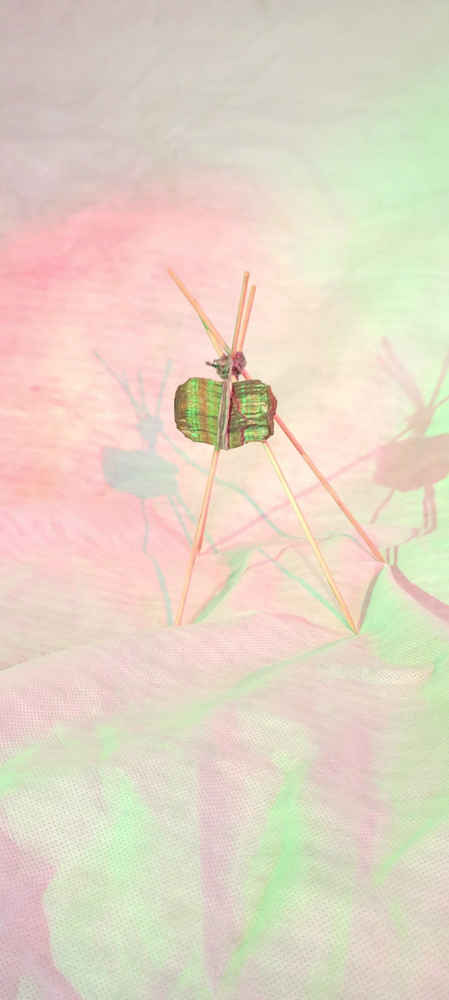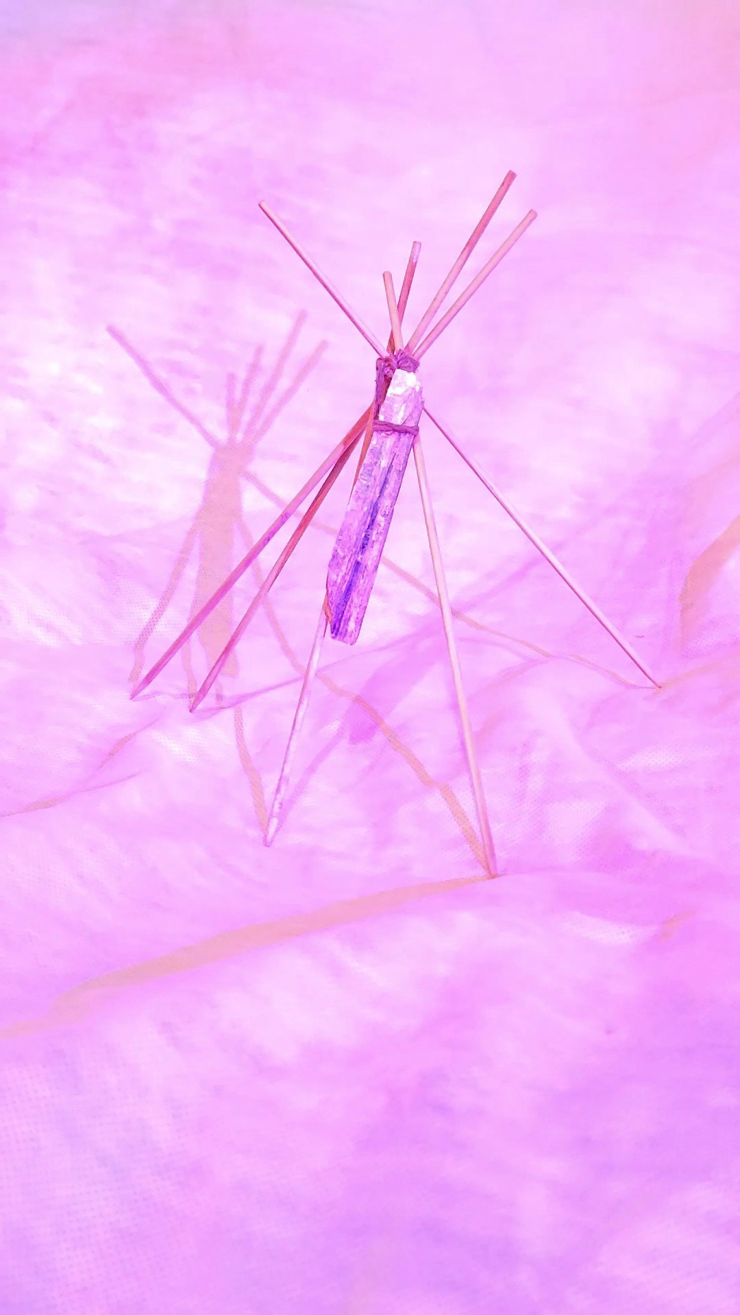 Estas imagens registram a série de esculturas intitulada “Naves Sensitivas de Contato Suave”, concebidas como abrigos mínimos — estruturas frágeis, porém energéticas, erguidas com madeira, pedra e luz. Elas operam como arquiteturas simbólicas para uma comunicação transespecífica. A escolha de cristais como olho de tigre, cianita azul e selenita ativa um campo sensível onde força, clareza e canalização se entrelaçam.