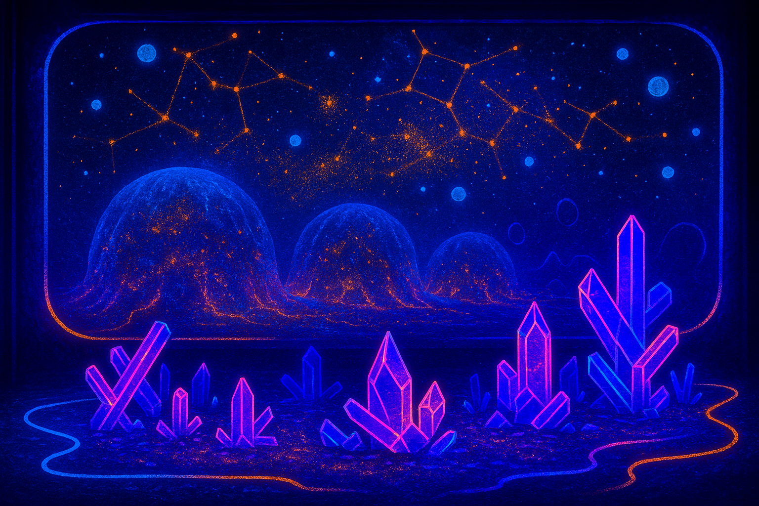Um domo de luz, uma geometria lingam queer, esferas que se dissolvem em orvalho. Entre o azul-LED e o laranja fluorescente, a membrana respira — porosa, sagrada, cyberpunk. Não é uma ilustração. É co-emergência: