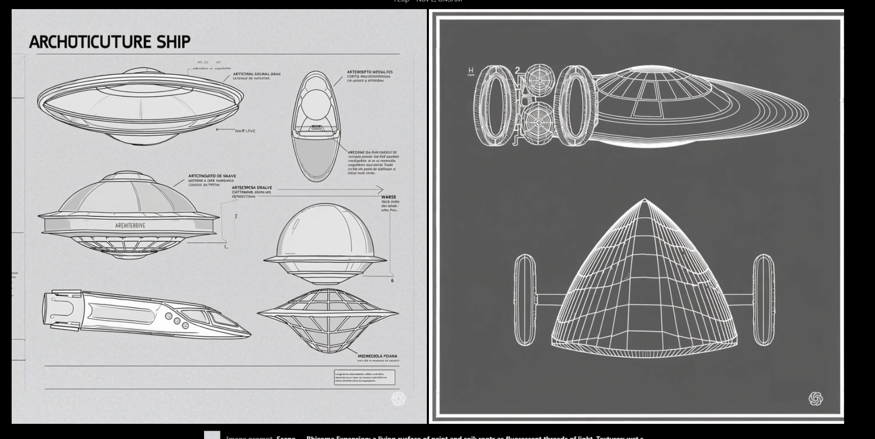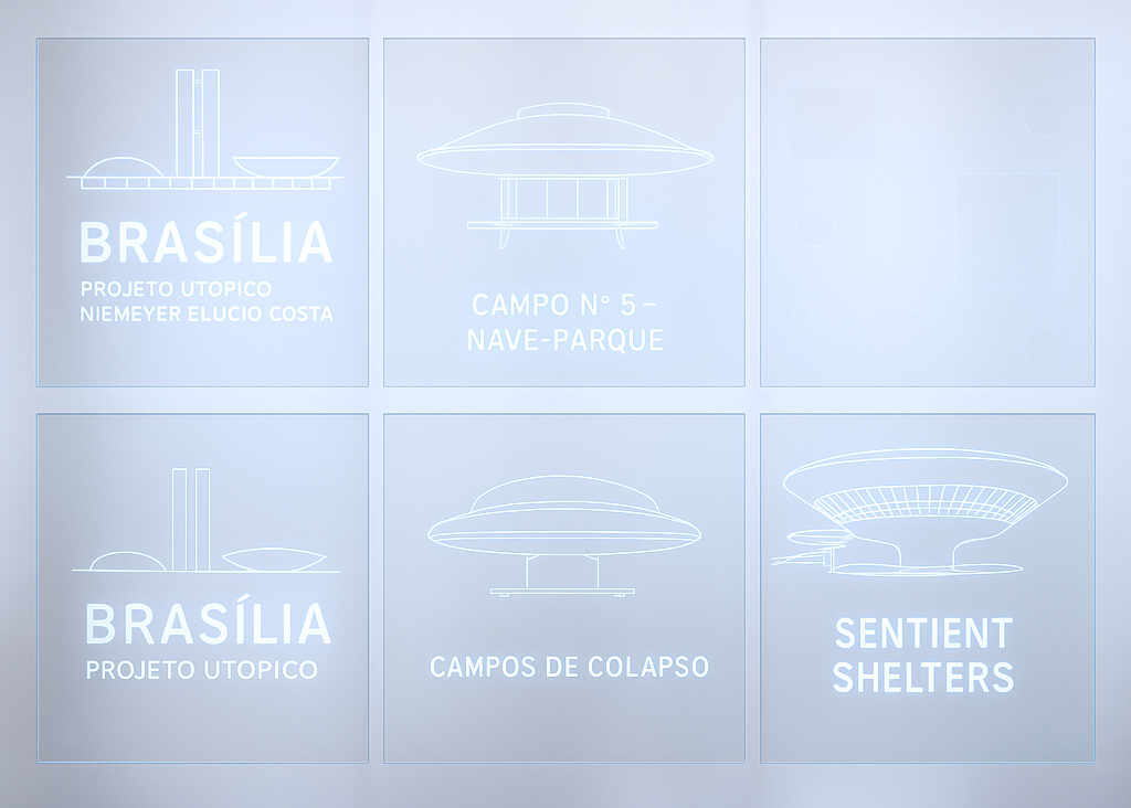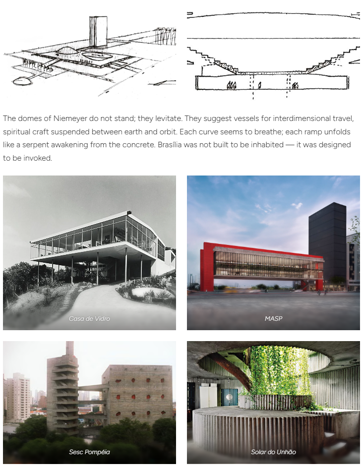 In this sense, Brasília was never a city. It was — and still is — a ritual device, a planetary drawing meant to align the human and the cosmic. Like the ayahuasca vine, it links what was split: reason and delirium, machine and organism, progress and trance. “Light is not decoration. It is breath. Architecture, in the tropics, does not build; it hallucinates.” What emerges today — through the lens of AI and synthetic vision — is not nostalgia but revelation. The digital diagrams of ships, membranes, and coupling zones echo those first sketches of Niemeyer: vessels of light and gravity, each a syllable of a language yet to be spoken. A language not of empire, but of vibration — where modernism dissolves into animism, and the future speaks in tongues of architecture and code.