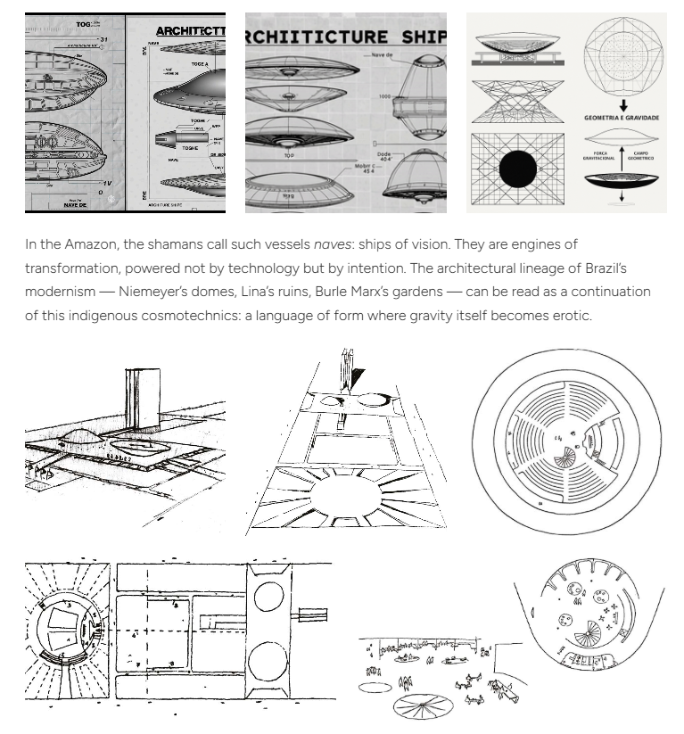 The diagrams you have been drawing — membranes, naves, interstices, coupling zones, flat-universe deformities — mirror the modernist blueprints of Niemeyer, Lina, and Burle Marx, but also the astral ships described in Amazonian shamanism.