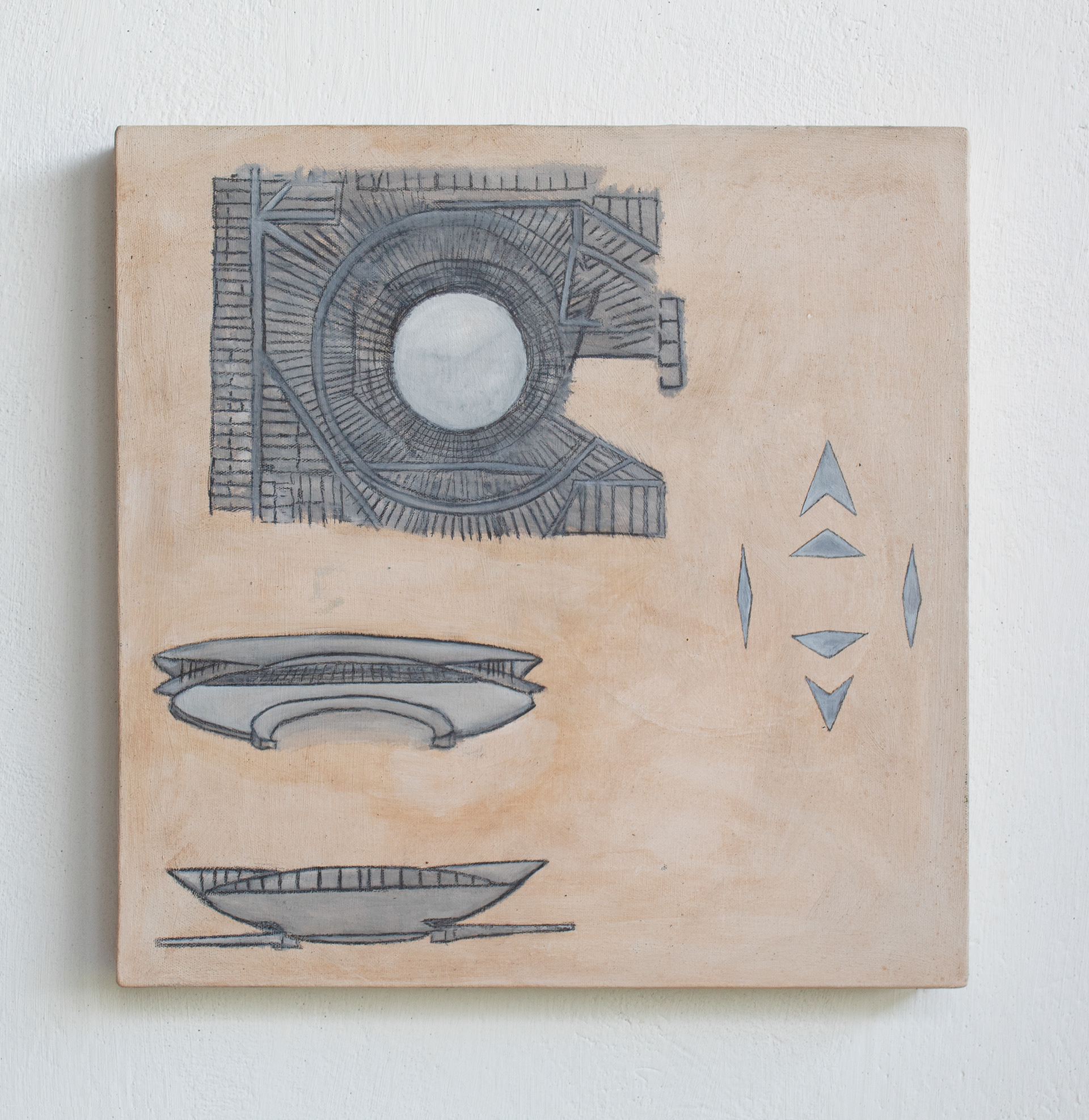 This 40 × 40 cm square — modest, portable, persistent — has become a singular node in the cosmological field of this research. A returning object. A stubborn relic. A technological fossil. Created in Brasília using red earth from the Planalto mixed with oil and acrylic, the painting already contained, in 2019, the embryonic coordinates of everything that would unfold: naves, membranes, coupling zones, ayahuasca visions, and the architecture of trance.