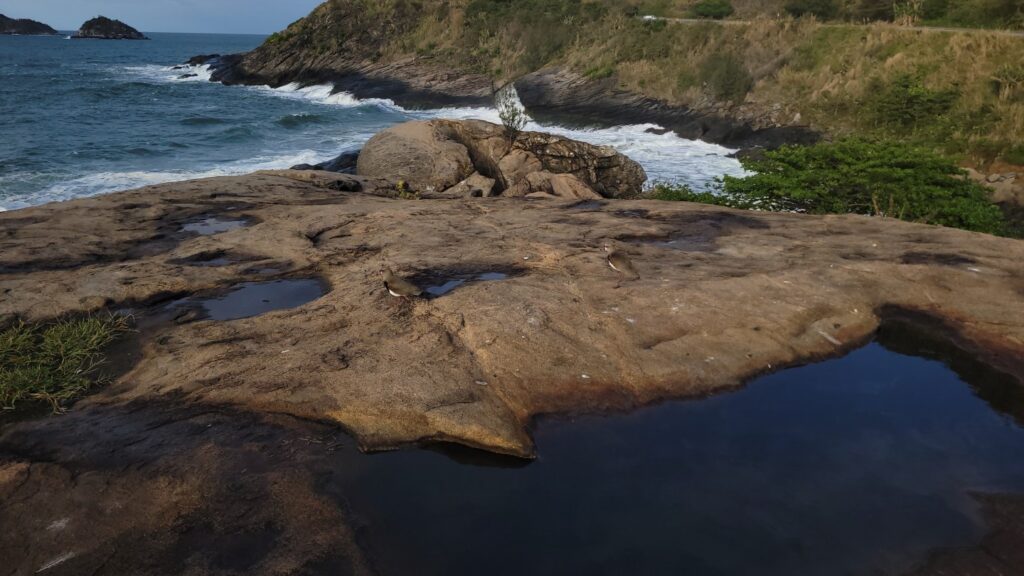On the stone near the sea, shallow basins hold water like temporary skies. Two small birds move through the reflections as if walking across liquid mirrors. The coastline becomes a laboratory of perception where geology, tide and light cooperate in slow experiments.