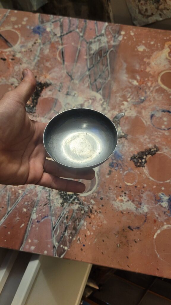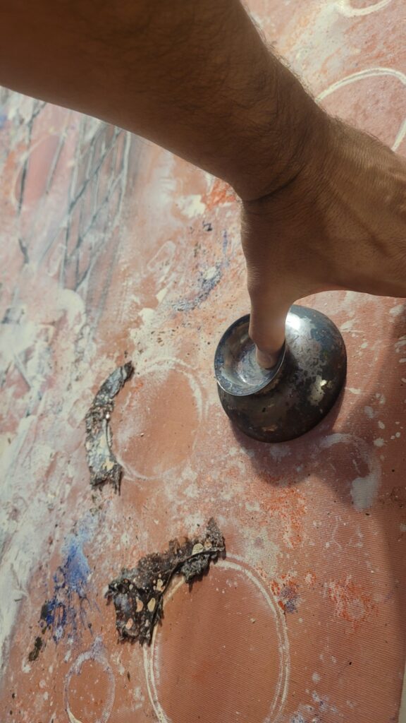 Later, in the studio, a small metal cup becomes an eye embedded in the painted membrane. Concave, reflective, gathering light. A technological iris resting inside a field of pigments, oils and fragile residues of paper that once touched liquid color.