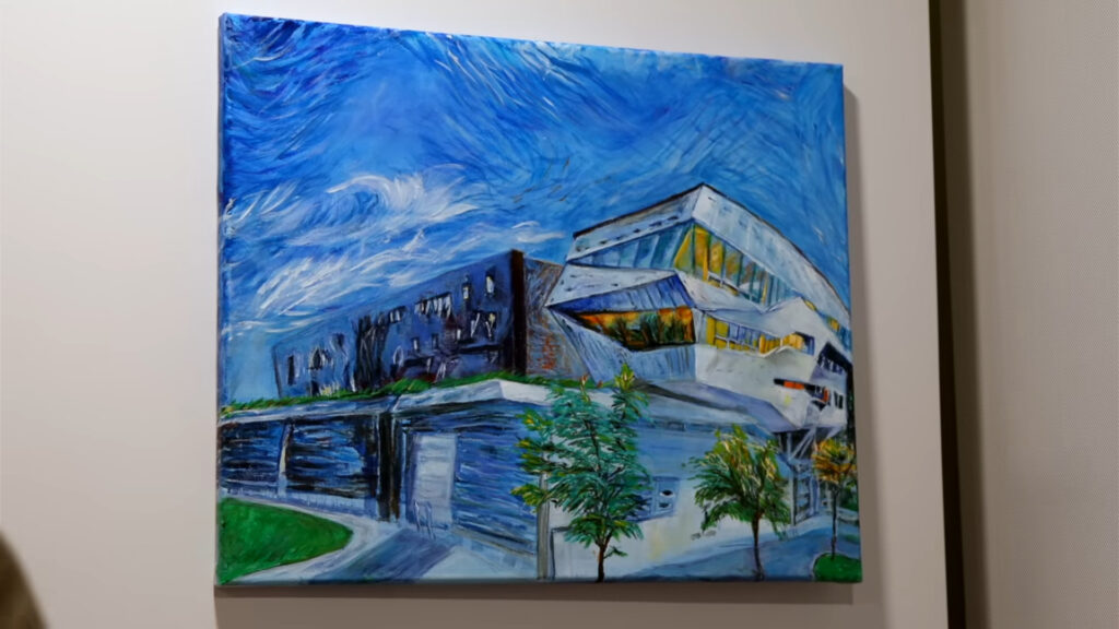 The very first frame of the video shows a painting — a vibrant architectural scene rendered with expressive strokes. It was created by Sabrina Gonzalez Pasterski’s mother, inspired by the building where her daughter now explores the deepest structures of reality. It’s a quiet detail, almost easy to miss, yet it reveals something profound: art and physics are not separate worlds but parallel ways of asking the same question.