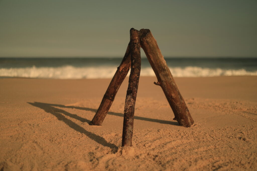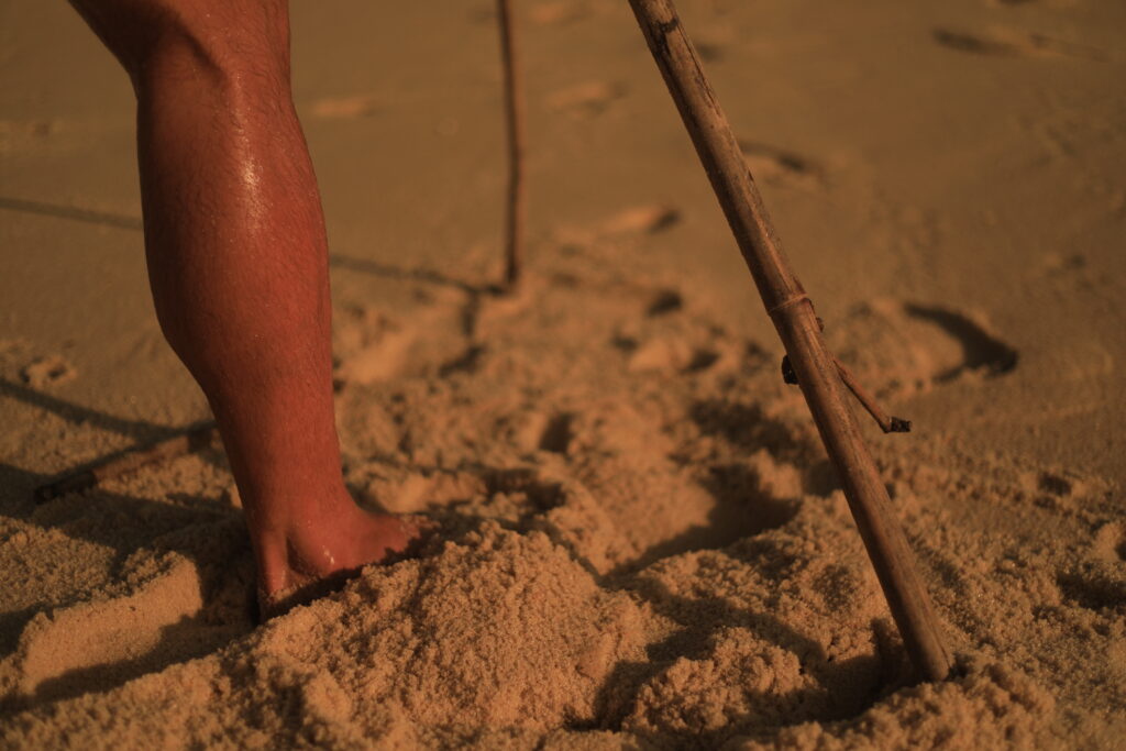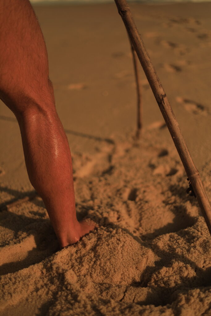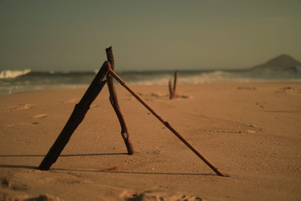 A busca pela batata da perna é a nossa travessia. As imagens registradas por João Penoni na Praia do Pontal em abril de 2026 capturam essa transição. Inicialmente, vemos as mãos humanas, como extensões superiores do sapiens, construindo uma estrutura de galhos na areia sob uma luz dourada, como um eco do “Shelter: Prometheus Preto e Vermelho” com seu braço incendiário e aromático.