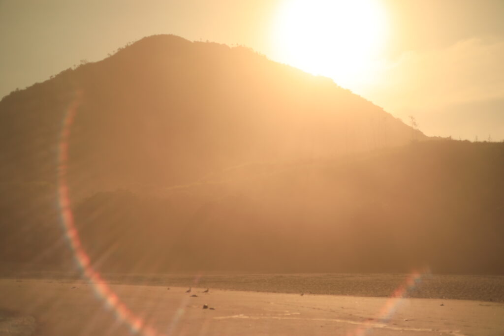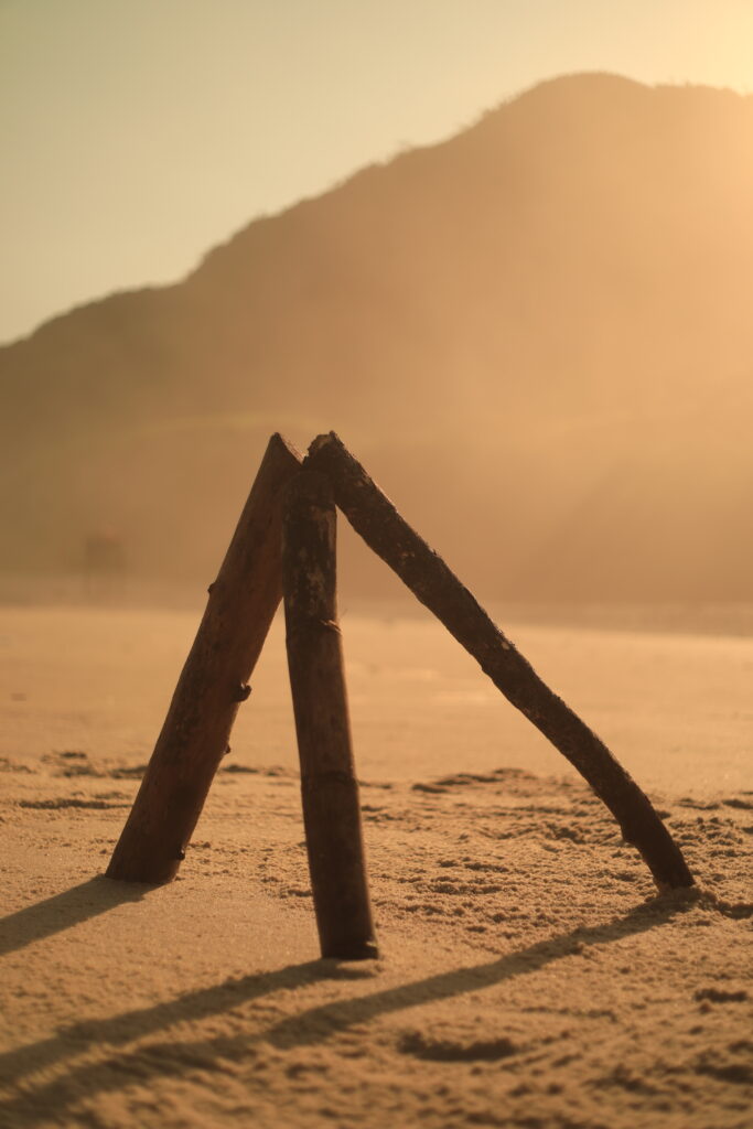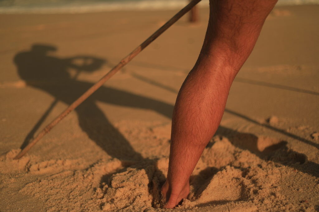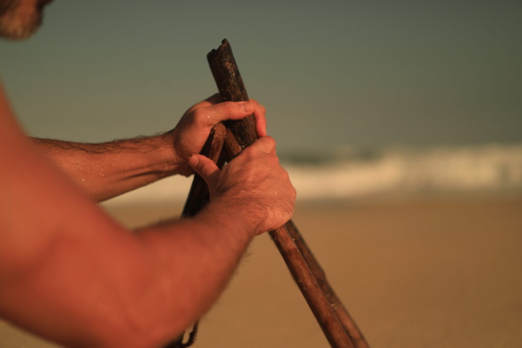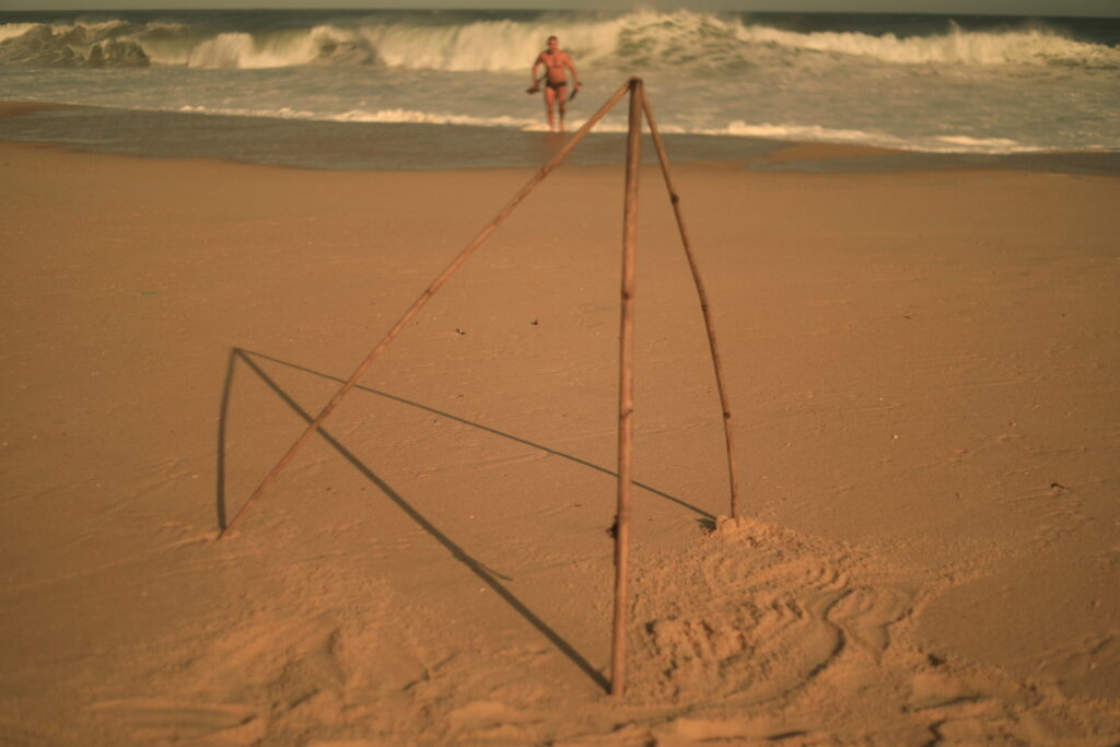 A busca pela batata da perna é a nossa travessia. As imagens registradas por João Penoni na Praia do Pontal em abril de 2026 capturam essa transição. Inicialmente, vemos as mãos humanas, como extensões superiores do sapiens, construindo uma estrutura de galhos na areia sob uma luz dourada, como um eco do “Shelter: Prometheus Preto e Vermelho” com seu braço incendiário e aromático.