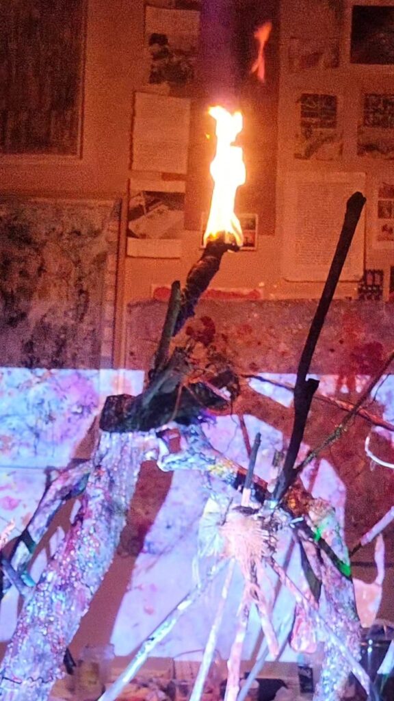 O fogo que devora a estrutura no breu do ateliê — capturado nas sequências de vídeo — não é um agente de destruição. Ele é, como você bem definiu, a manifestação do chisei (a inteligência na matéria). A luz intensa que cega temporariamente a lente e desenha novas geometrias nas sombras é a forma mais pura de conhecimento sensorial. É a energia estática da madeira e da cera transformando-se em movimento, calor e fumaça.
