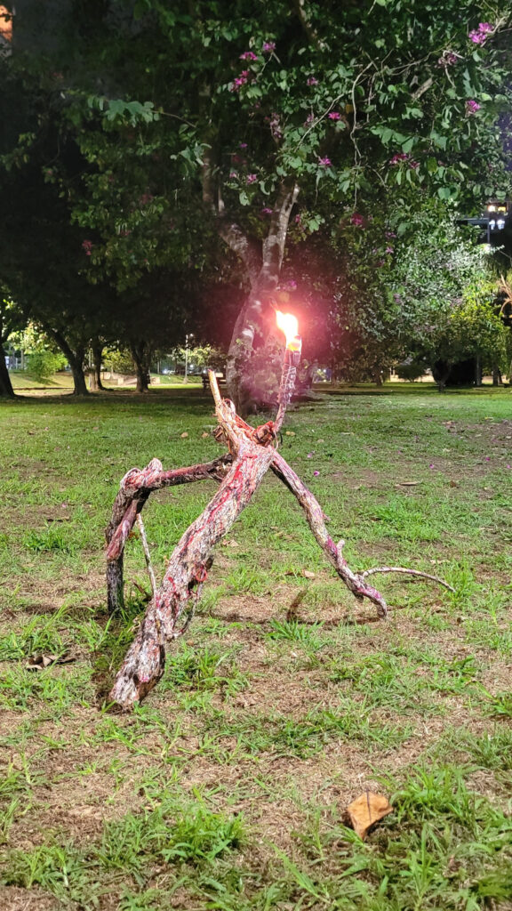 “A peça feita de galhos, cordas e tintas e cera vermelha e preta incorpora um “braço” de tecido e material combustível que é aceso durante a performance, exalando fumaça aromática. Em sua forma híbrida, meio orgânico meio artificial, a escultura evoca a figura mítica de Prometeu trazendo o fogo – aqui um fogo vermelho e preto, de cheiro intenso, que liga arte, política e tecnologia.”