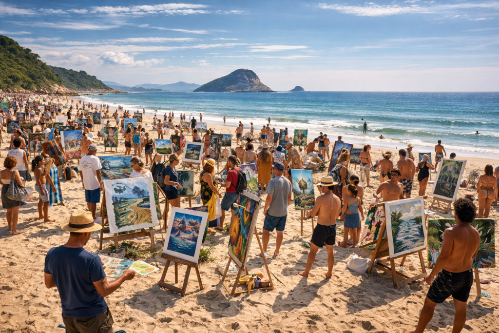 No Pontal, uma feira de arte acontecia diretamente na areia. Cavaletes improvisados, trabalhos recém feitos ao lado de obras maduras. Qualquer pessoa podia participar. Artistas locais que nunca haviam exposto dividiam espaço com visitantes que chegavam de outros países carregando seus trabalhos à mão. Não havia seleção. O critério parecia ser apenas a decisão de mostrar.