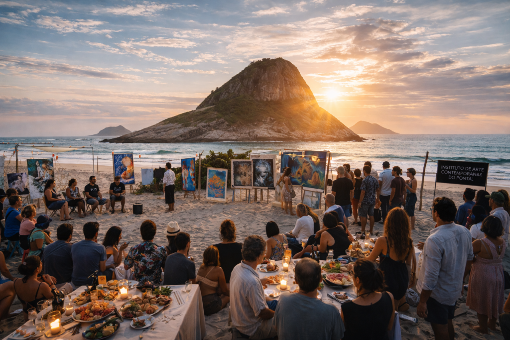 À noite, em Grumari, festas e jantares se organizavam como verdadeiros dispositivos curatoriais. Era ali que se descobriam afinidades, que obras trocavam de mãos, que pessoas que jamais se identificaram como público de arte se viam envolvidas em conversas sobre pintura, paisagem e tempo. A comida, o fogo, a música e o corpo coletivo produziam um tipo de conhecimento que nenhum catálogo conseguiria registrar.