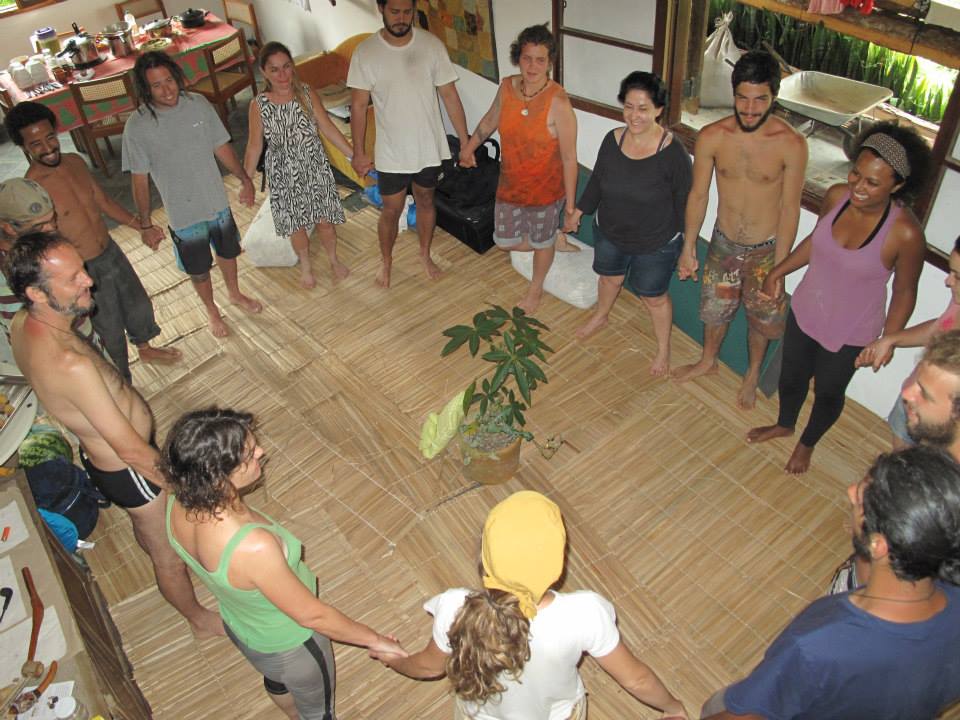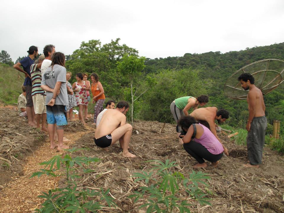 Entre uma sessão e outra, aprendia-se a transformar o mundo. Cozinhar moqueca de jaca, lasanha de casca de banana verde, devolver restos à terra em compostagem. Ali ergueu-se também uma Oca, não apenas abrigo mas nave construída em conjunto, espécie de máquina de barro e madeira onde se aprendia a respirar a vida coletiva.
