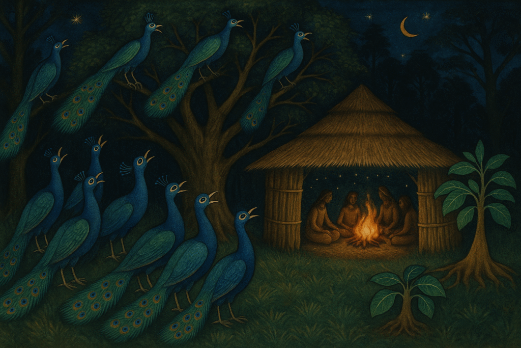 The evidences are these: peacocks singing as echoes of the improbable, a human circle around a tree, bodies entrusted to clay. Between the end of the village and the beginning of the forest, he discovered that every margin is also a portal. And that the archive, more than a record, is a garden that insists on blossoming.