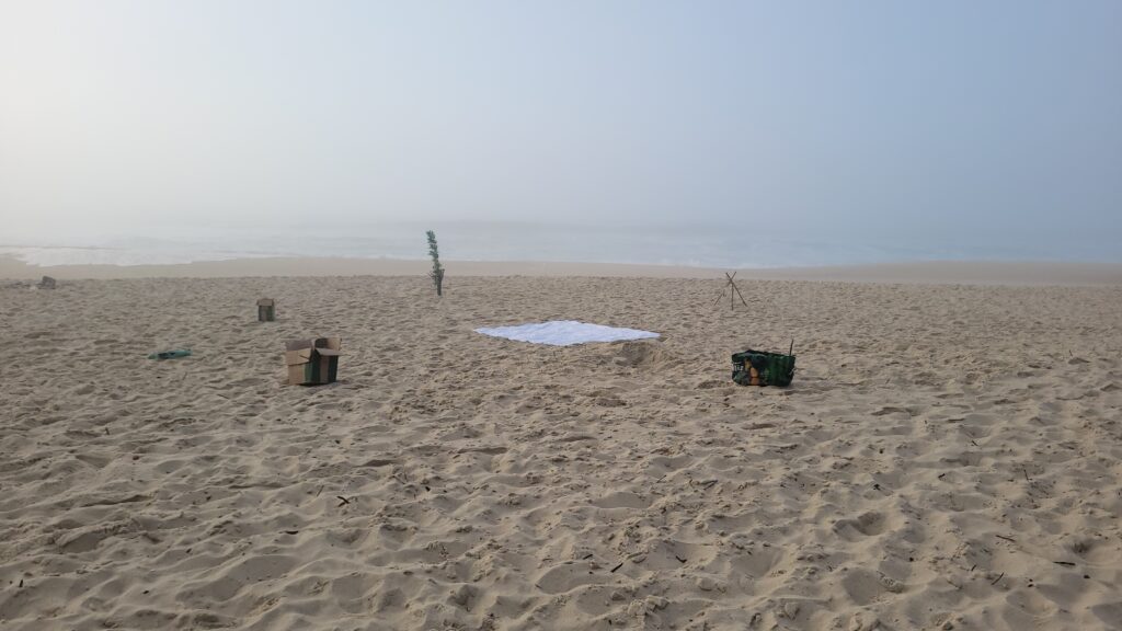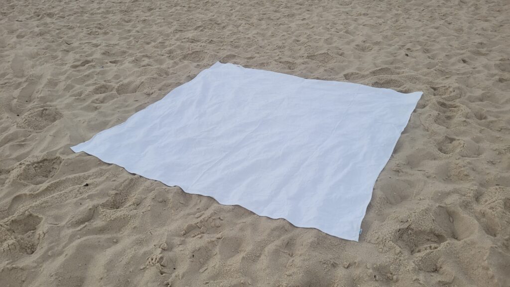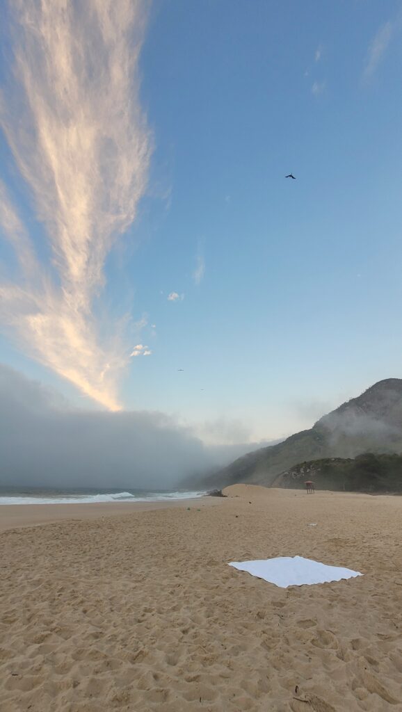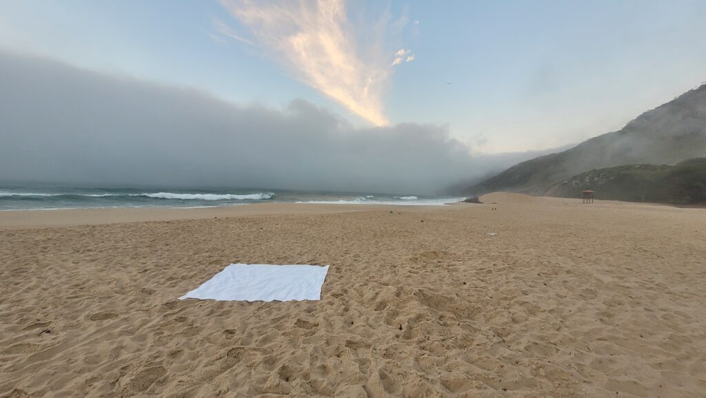 O quadrado branco na areia — simples, doméstico, tecido para o corpo — transforma-se em um sensor simbólico, uma superfície de revelação. Ele não é mais toalha: é um campo de inscrição. Um lençol para o invisível escrever sobre o mundo. O vento, o sal e a luz tornam-se caligrafia.