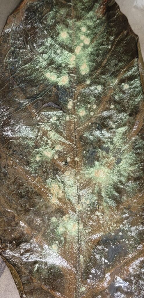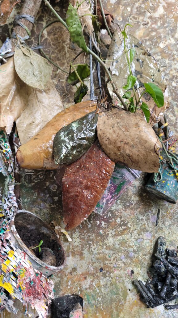Inside, Rodrigo prepares the leaves—vernished, sealed, transformed into mineral membranes.
