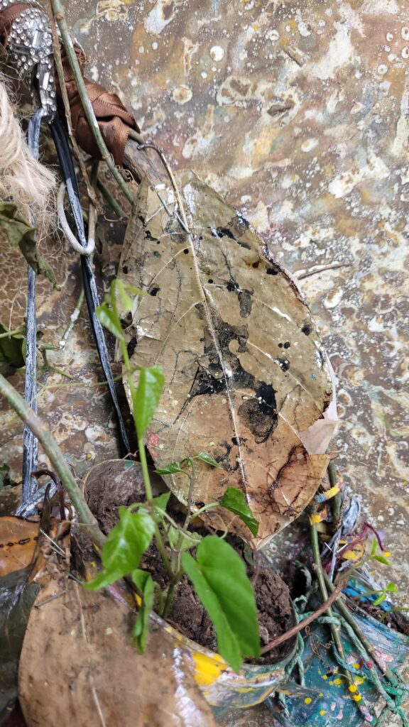 He anchors the leaves to the canvas with hooks and roots, letting cables and vines act as arteries.