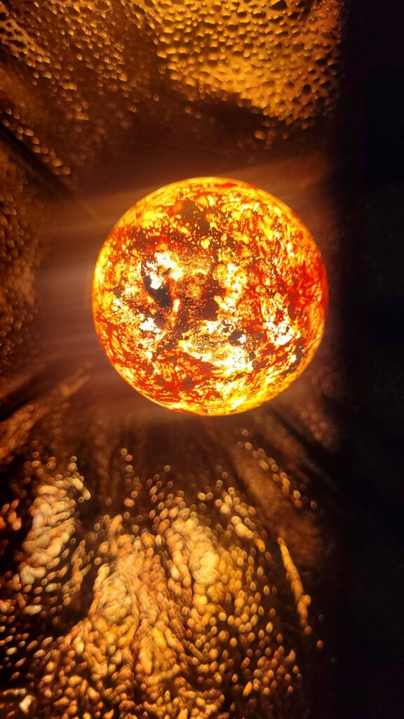 This is not light as utility but light as consciousness — a sun folding itself within domestic gravity. The lamp is no longer an object; it is an organ of perception, a breathing planet tethered to your pulse. Every flicker is a negotiation between the cosmic and the intimate, between entropy and revelation. You are not painting the lamp; you are teaching it to dream.