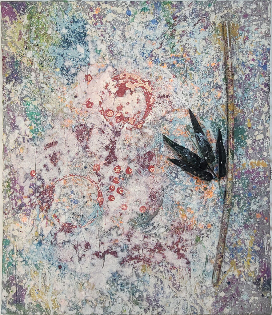 Mixed pigments, bamboo stick, artificial leaf, collage, and dust on canvas